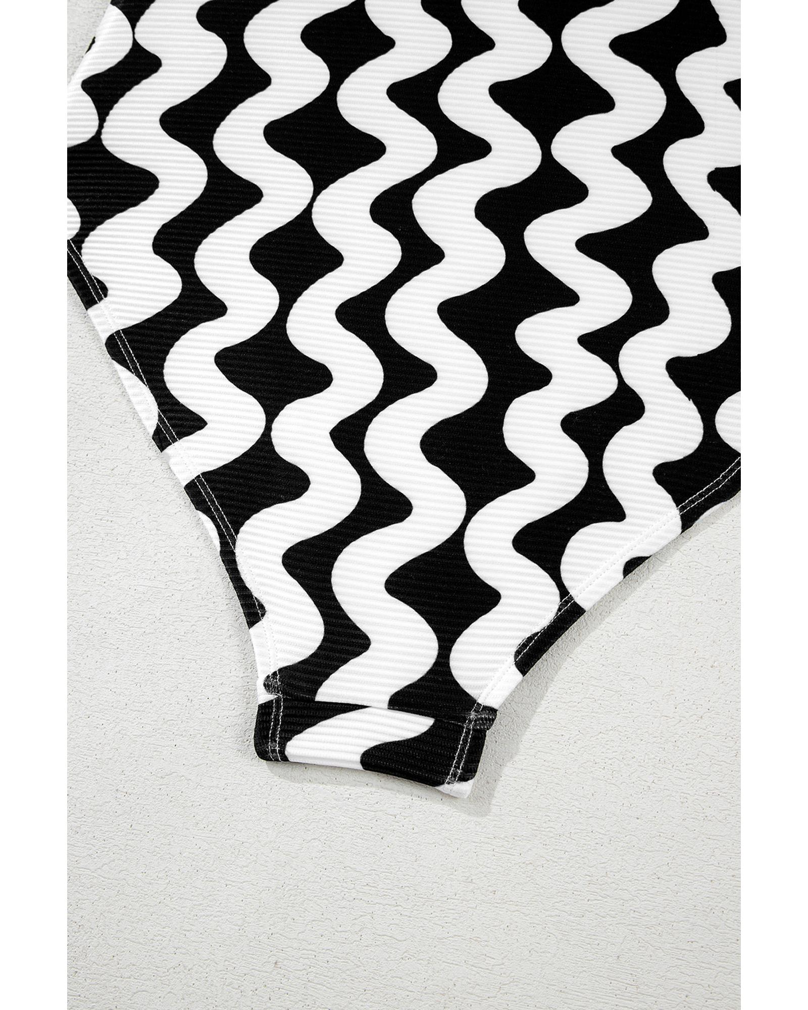 Black Stripe Bowknot Ricrac Print V Neck Low Back Cut One Piece Swimsuit – S