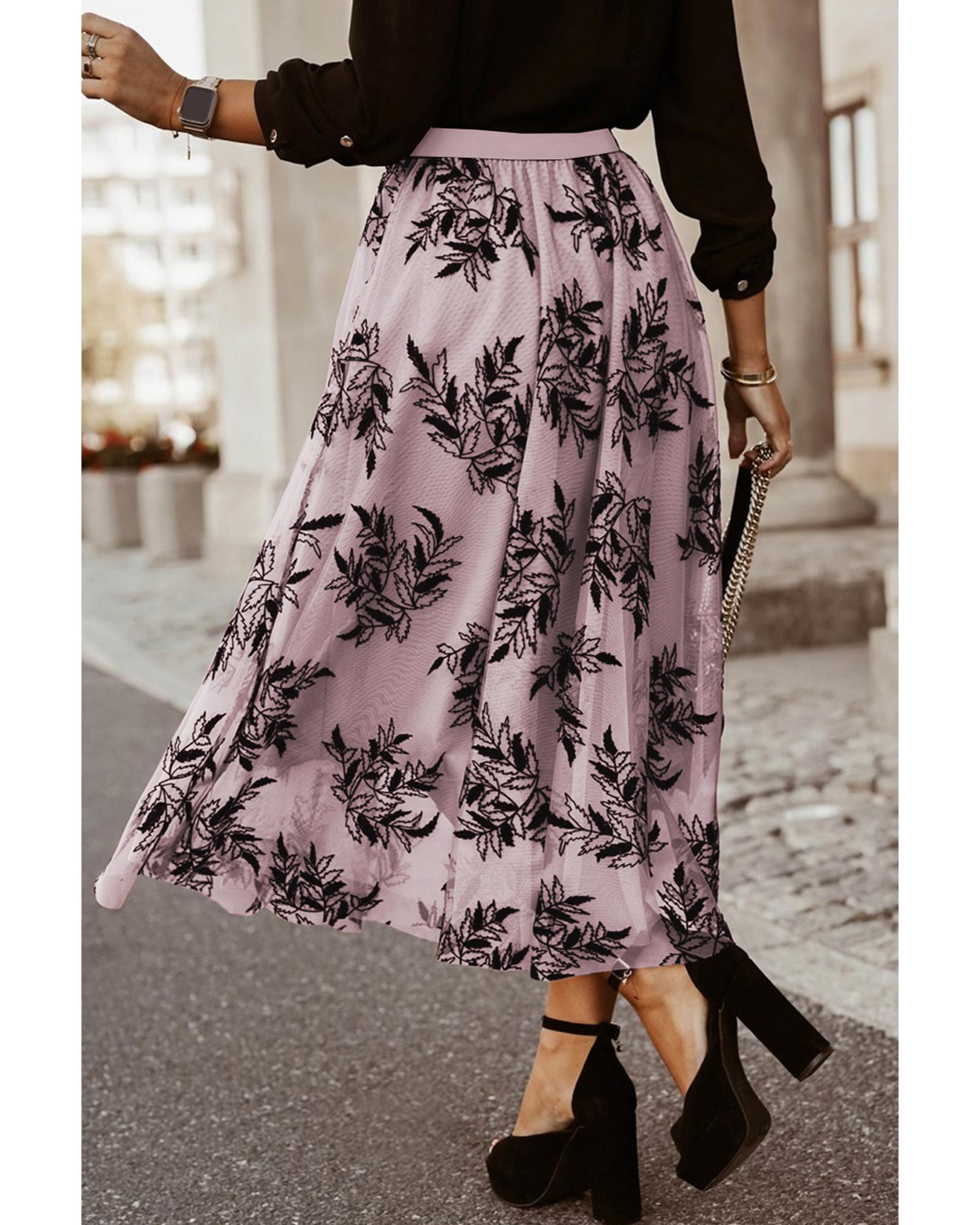Peach Blossom Floral Leaves Embroidered High Waist Maxi Skirt – XL