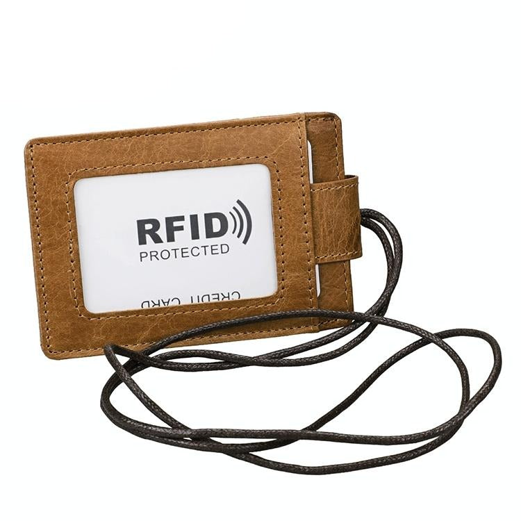 Leather Rfid Card Holder Lanyard – Compact & Secure – Yellowish-Brown