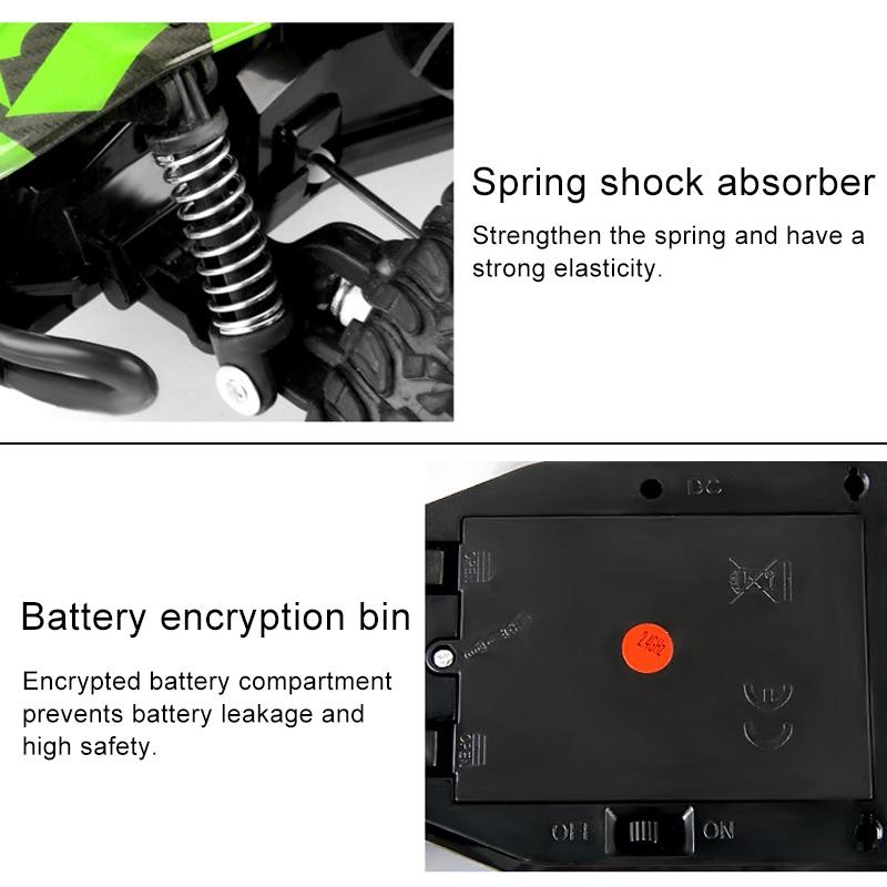• 2.4G remote control system, speed 25KM/H, off-road climbing function, extreme speed drift shift, remote control left and right hand switch