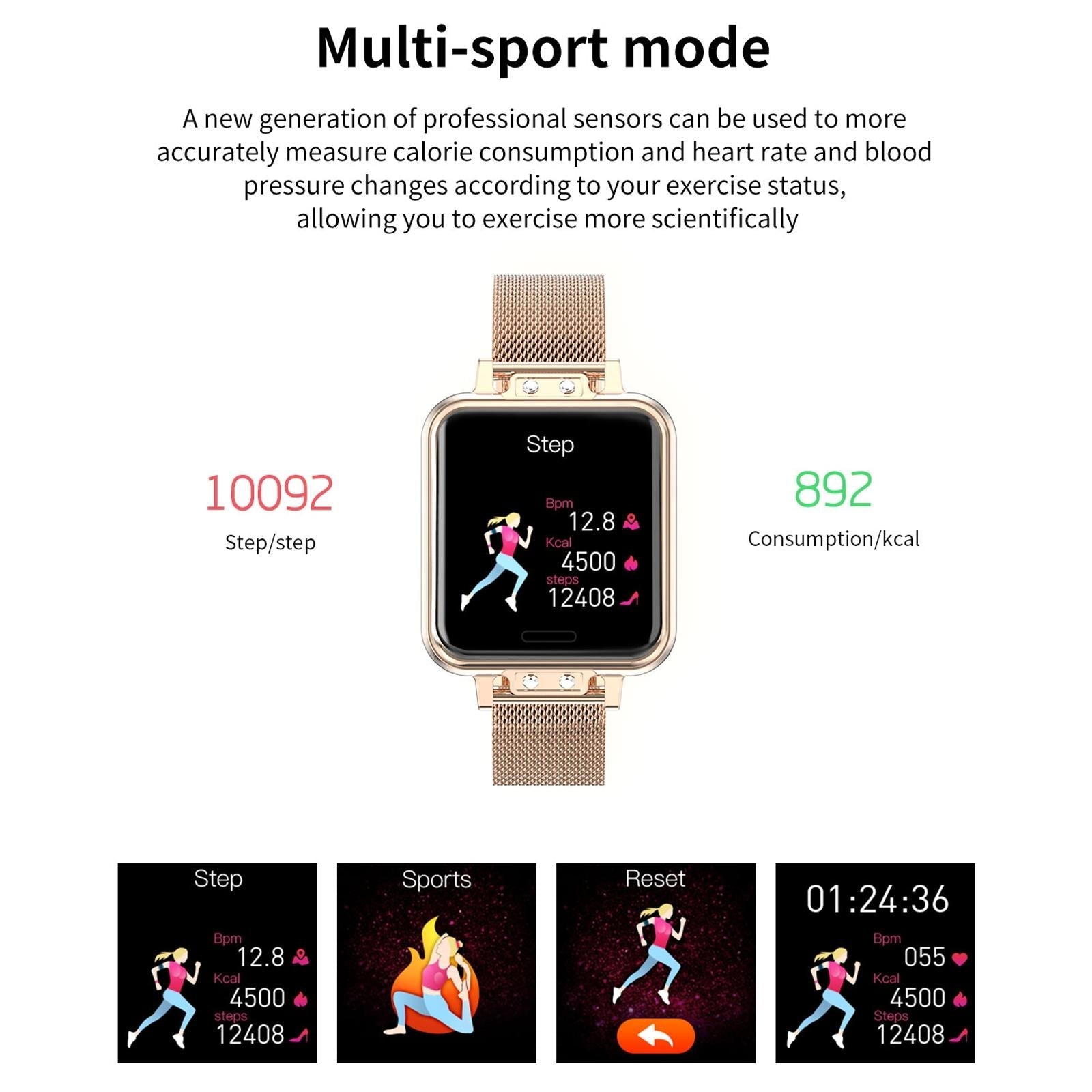 • Functions include call, SMS, WeChat, and QQ reminders, exercise tracking, sleep monitoring, heart rate and blood pressure detection, exercise mode, remote photo, sedentary reminder, phone finder, and menstrual cycle reminder