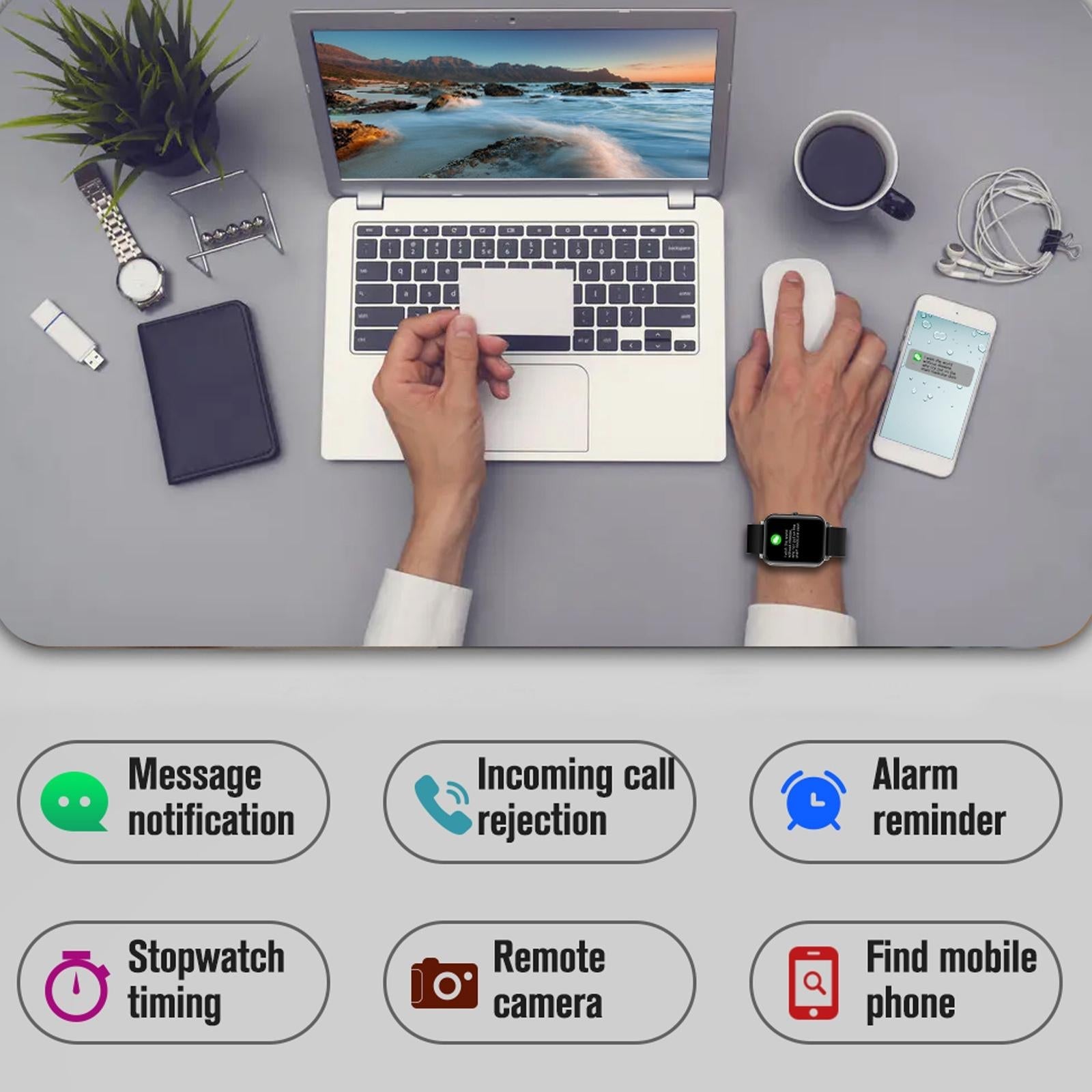 • Call, information, alarm clock, sedentary, water and medicine intake reminders