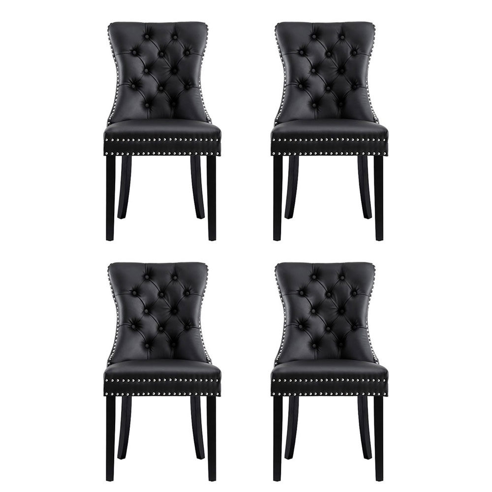 Elevate your dining space with this set of 4 Artiss Dining Chairs, designed to bring timeless charm to your home. Upholstered in your choice of PU leather or plush velvet, the chairs feature a button-tufted backrest and rivet edging for a sophisticated look. Crafted with a cushioned backrest filled with high-resilience foam, these chairs provide exceptional comfort during meals and gatherings. The rubberwood legs ensure reliable support, while anti-slip feet protect your floors. Perfectly blending style and practicality, these dining chairs make a stunning addition to any dining room.