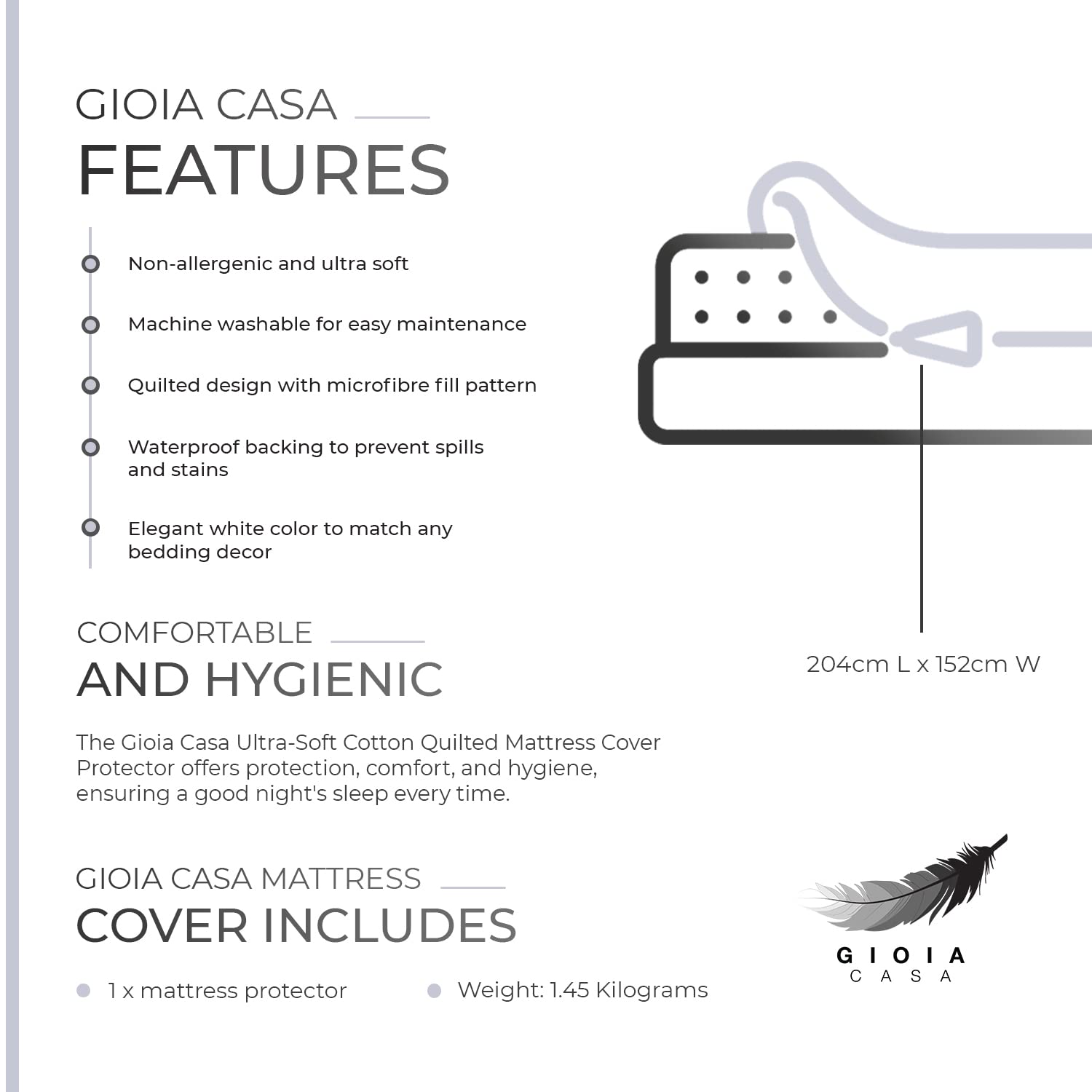 - Comfortable and Hygienic: Invest in comfort and protection with the Gioia Casa Ultra-Soft Cotton Quilted Mattress Cover Protector. This essential bedding item not only prolongs the life of your mattress but also provides the peace of mind you need for a restful nights sleep.