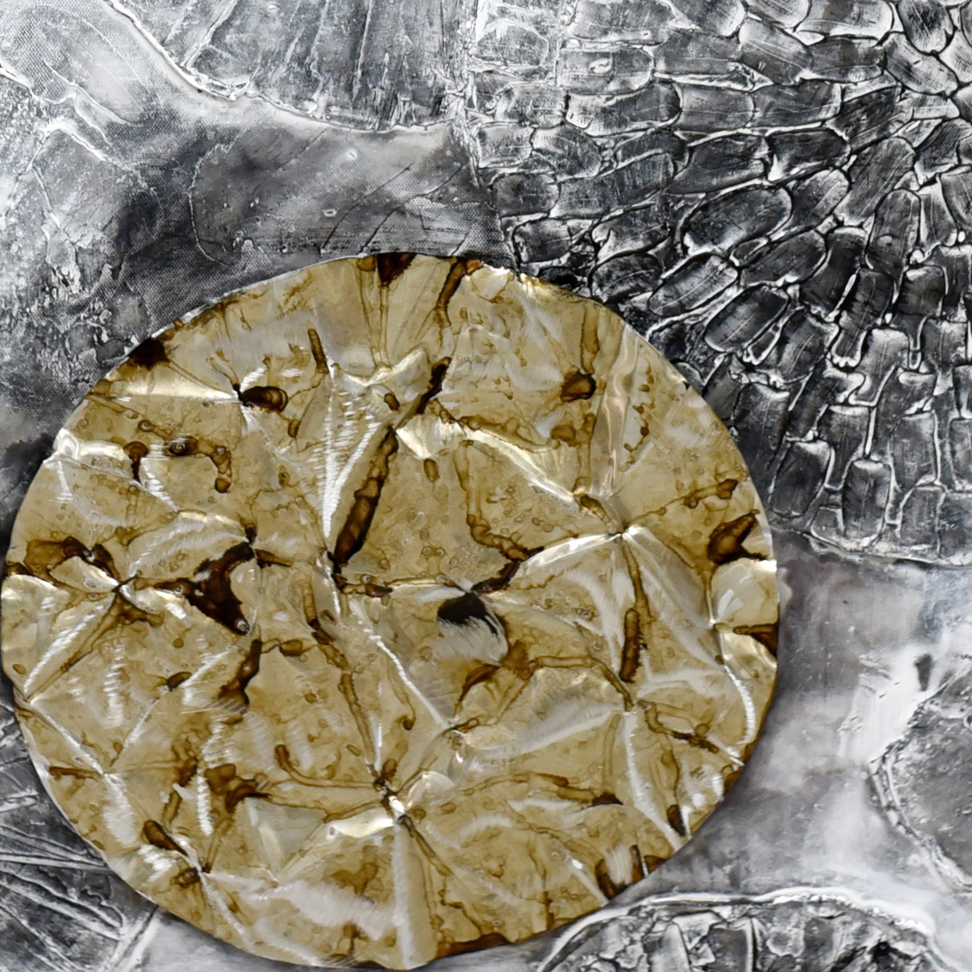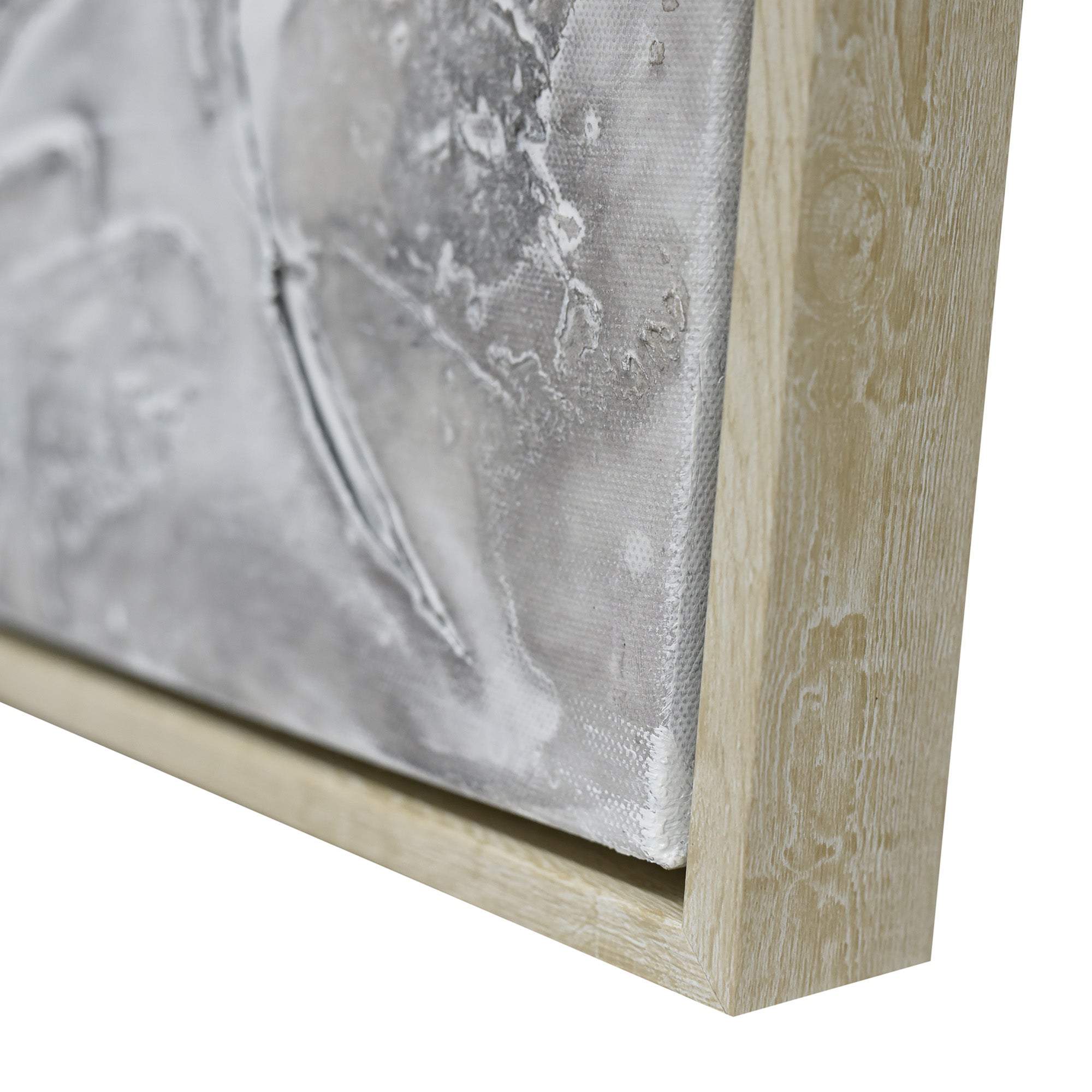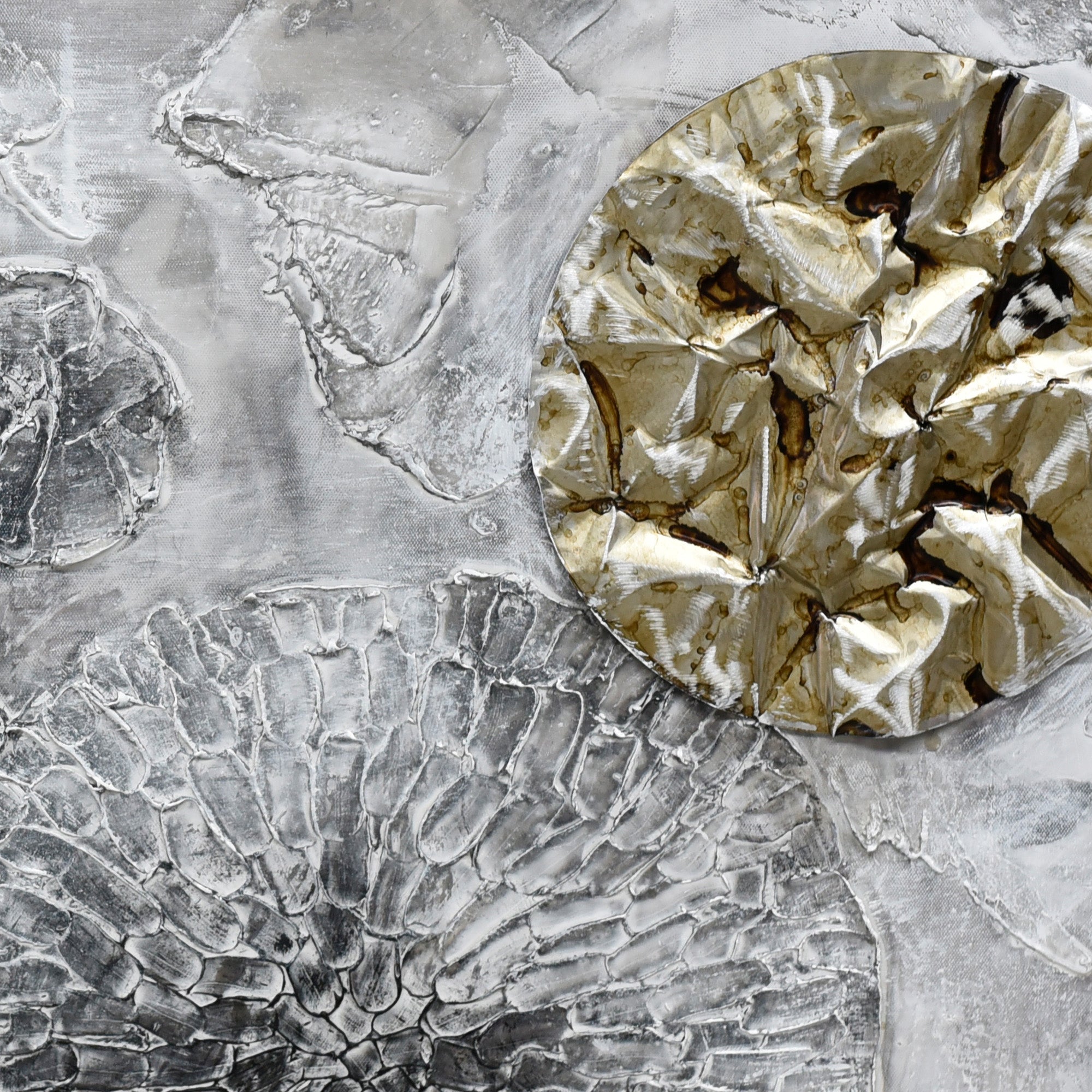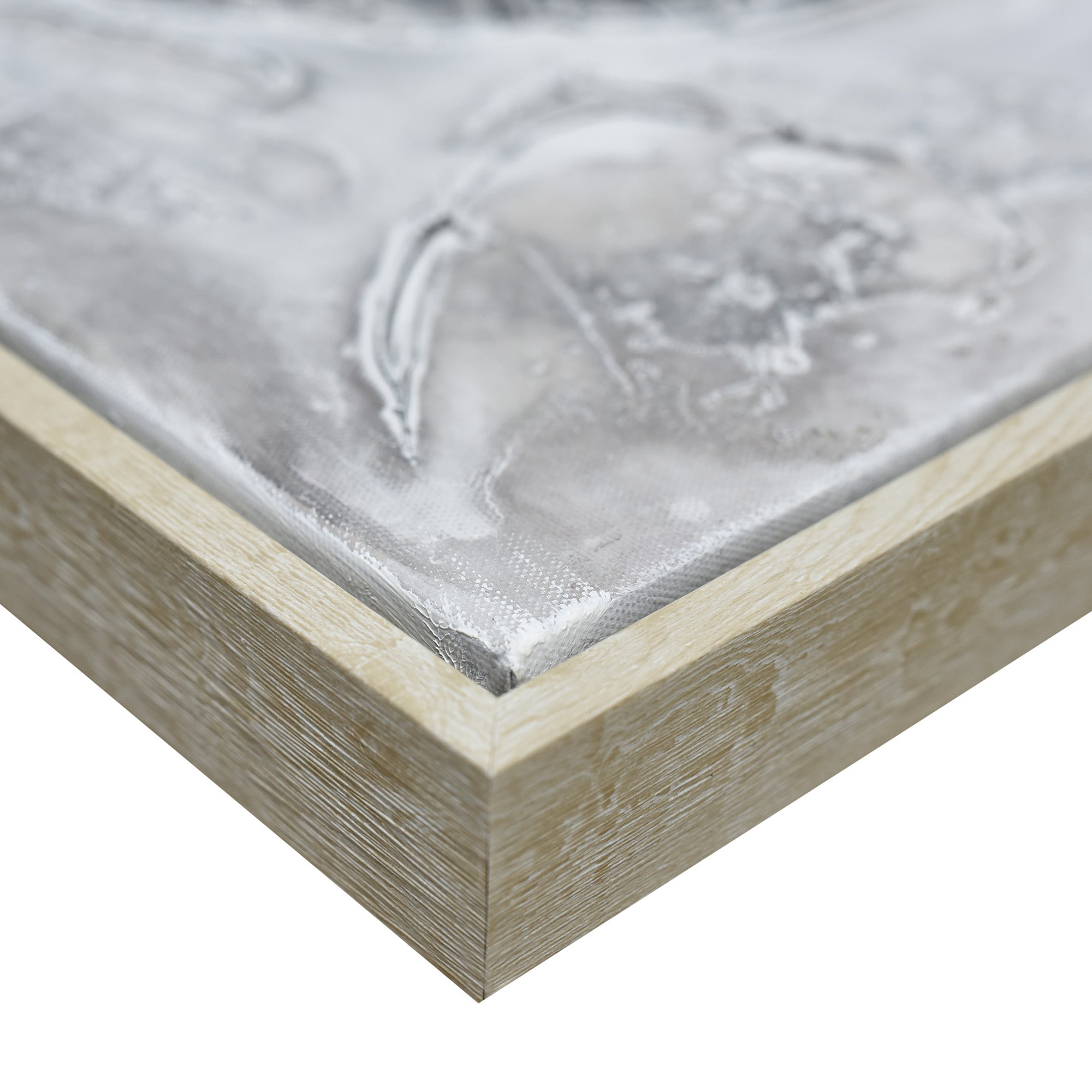 “Golden Orbs Amidst Ethereal Mists” is a mesmerizing 100cm x 100cm hand-painted canvas that transports viewers to an otherworldly realm. The artwork showcases an entrancing blend of texture and hue, framed exquisitely in light wood that amplifies its organic allure. Dominating the scene, two textured gold spheres emanate a radiant glow, grounding the composition and offering a luminous contrast to the surrounding elements. A delicate dance of five grey bubbles, each bursting with tangible texture, hovers nearby, suggesting movement and fluidity. The background whispers tales of distant horizons as fainter bubbles, mere suggestions of form, emerge from the white and grey stone-washed backdrop. Each layer of this piece beckons closer inspection, making “Golden Orbs Amidst Ethereal Mists” a captivating addition to any art collection or living space.