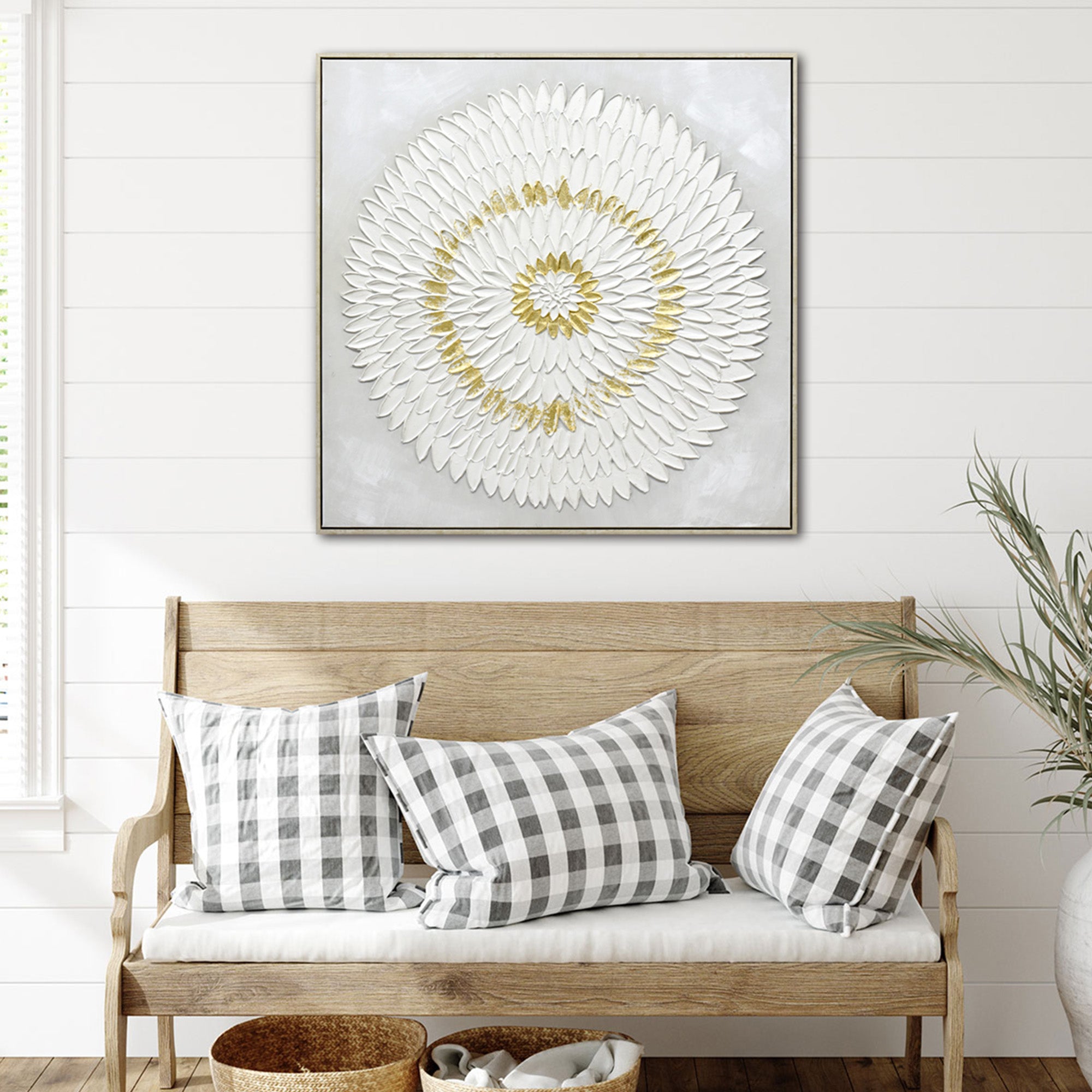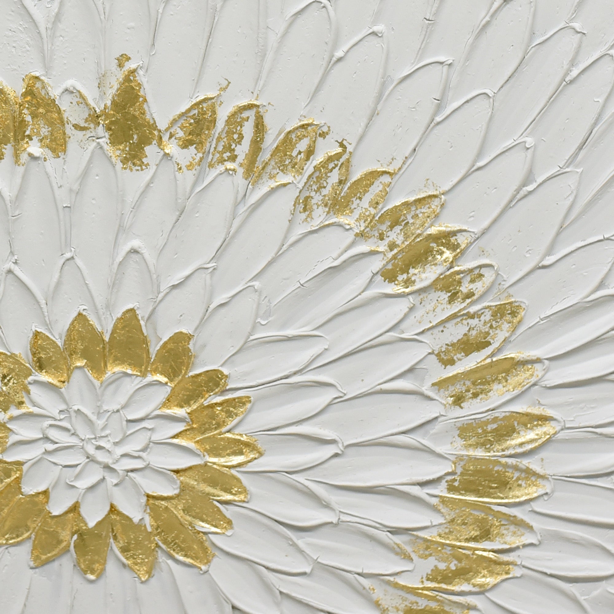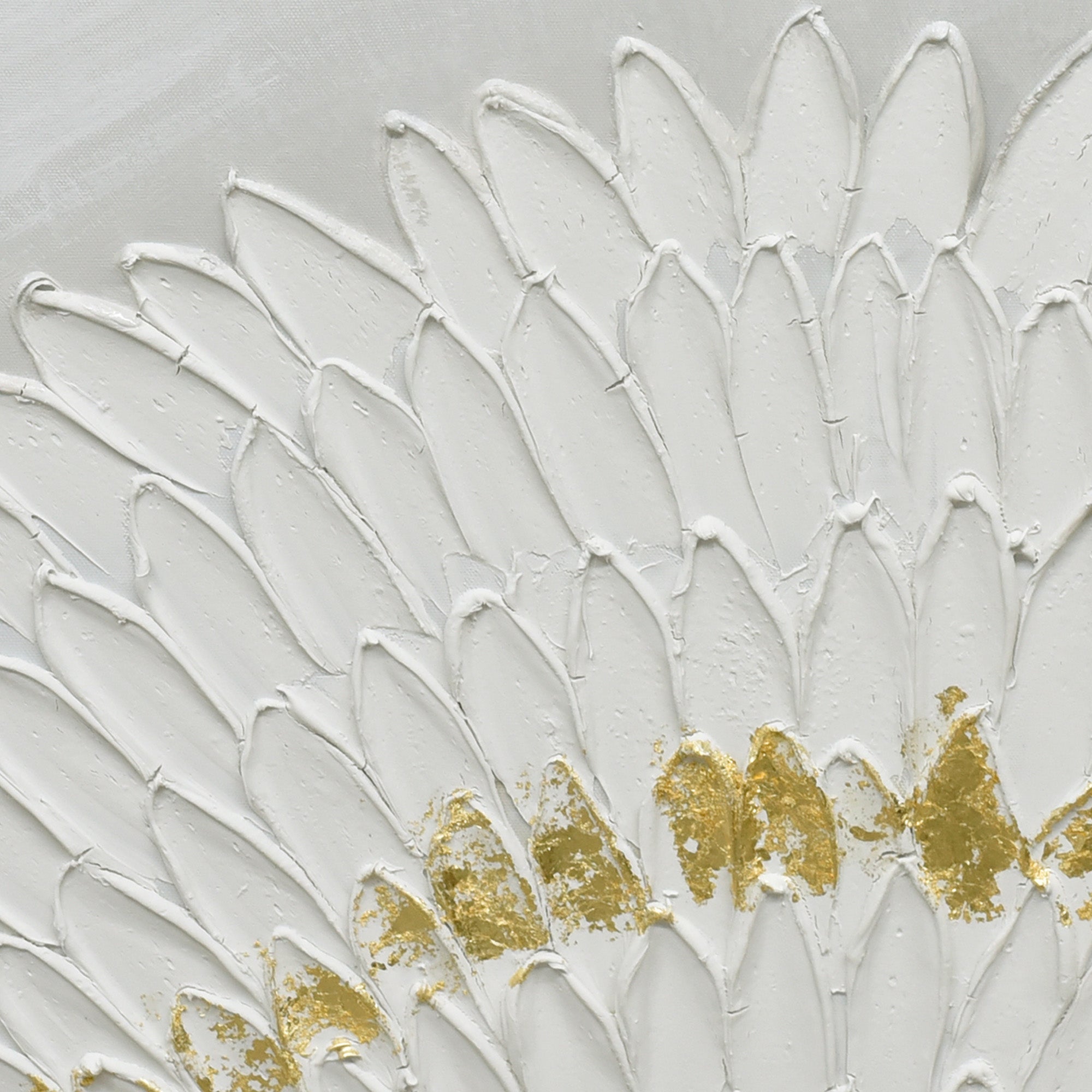 An evocative hand-painted masterpiece, “Lustrous Celestial Harmony” spans an impressive 100cm x 100cm canvas, framed beautifully with light wood that complements the primary white palette. The artwork captivates with a mesmerizing circular design, invoking the cyclical nature of life and the universe. At its core, two intertwined gold rings emerge, symbolizing unity and eternal bond. Interspersed throughout are delicate petal motifs, representing nature’s bloom and ephemeral beauty. Soft, ethereal feathers dance around the periphery, adding an essence of freedom and fragility. The thick texture technique utilized gives depth and dimension, inviting the viewer to get lost in its myriad intricacies. Every brushstroke tells a story, making “Lustrous Celestial Harmony” an enchanting conversation piece for any space.