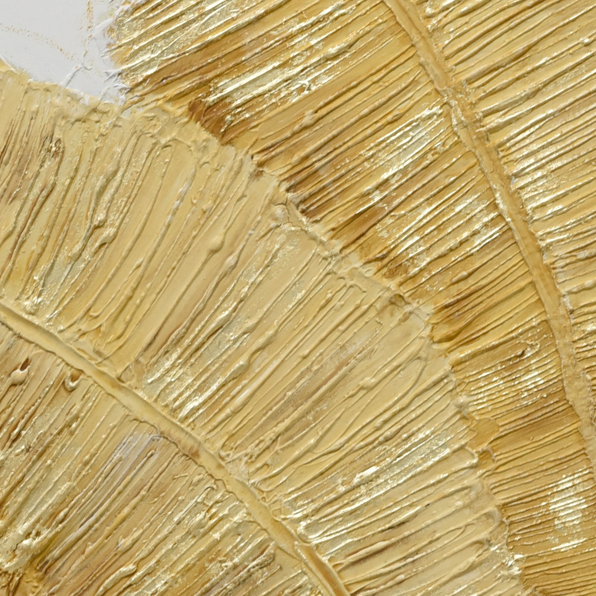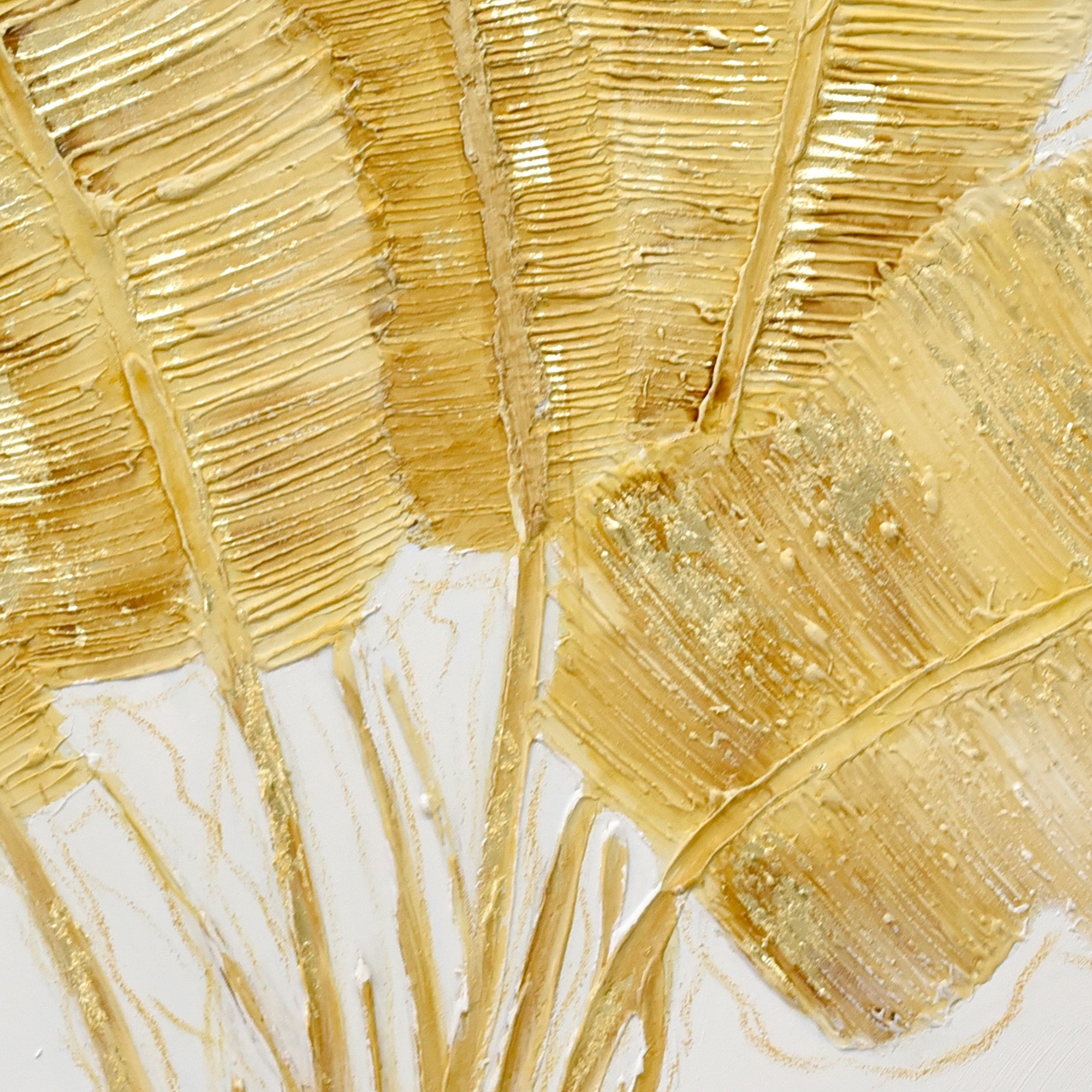 “Lustrous Leaves” is a captivating portrayal of nature’s splendor, capturing the essence of the banana plant’s leaves in a radiant yellowish-gold hue. Set against a pure white canvas, each of the five leaves is meticulously hand-painted with a heavy texture, emphasizing their intricate patterns and venation. This texture, combined with the luminous color, gives the leaves a tangible, almost three-dimensional quality, inviting viewers to reach out and touch. The dark wood frame juxtaposes beautifully with the bright and shimmering foliage, adding depth and contrast to the composition. “Lustrous Leaves” is not just a visual treat; it’s an ode to the beauty of nature, rendered with artistic precision and passion.