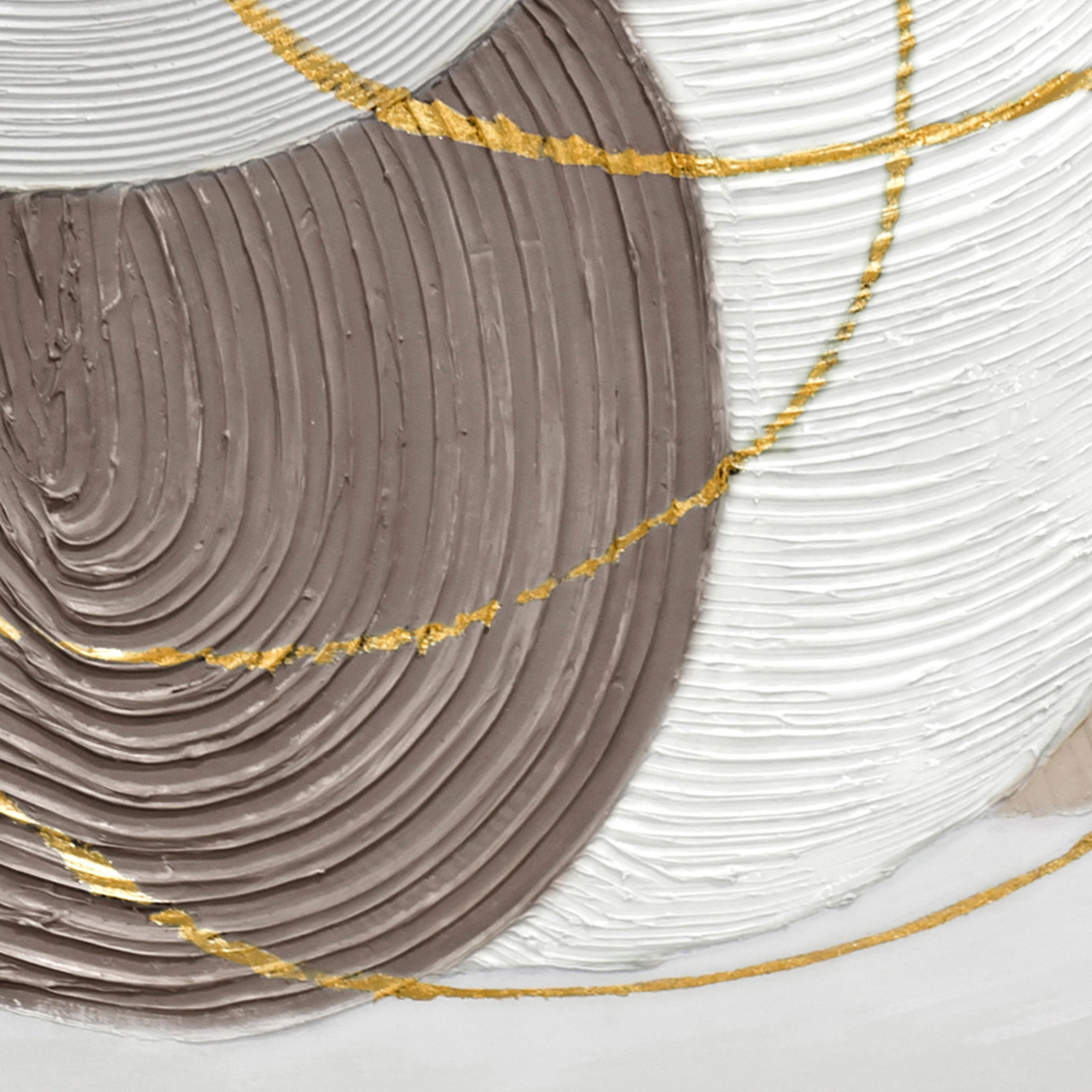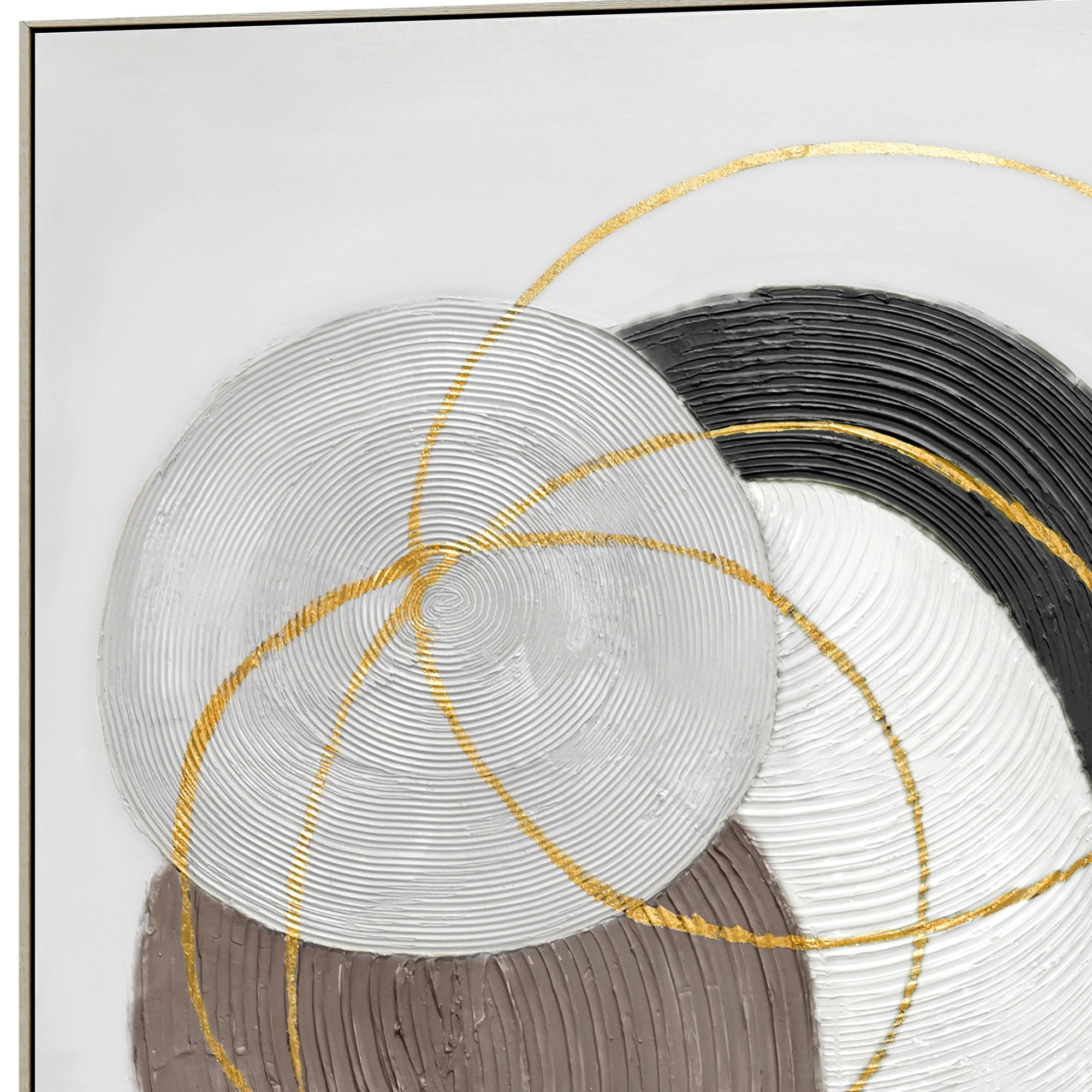 Dive into the mesmerizing world of “Martian Geometrics,” a 100cm x 100cm artwork that masterfully blends abstraction with geometry. This hand-painted creation showcases five solid circles, each adorned with thick, circular groove textures. The harmonious palette of grey, brown, white, black, and beige gives each circle its own distinct character, creating a captivating visual narrative. Overlaying this base are three ethereal golden-outlined circles, adding a touch of opulence and intrigue to the composition. Set against a very light grey backdrop, these elements come together in a dance of color, form, and texture. Encased in a light wood frame, this piece, with its thick textured details, is a testament to the beauty of abstraction and the elegance of geometric design.