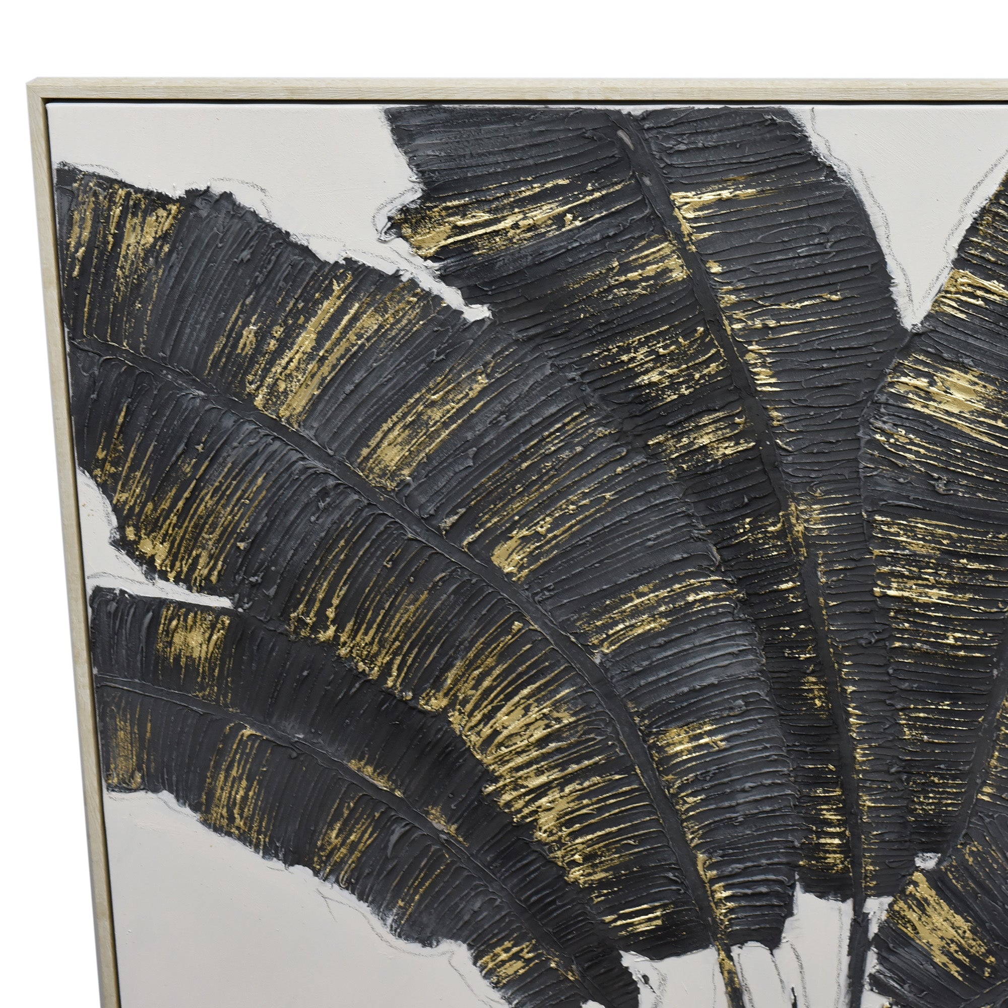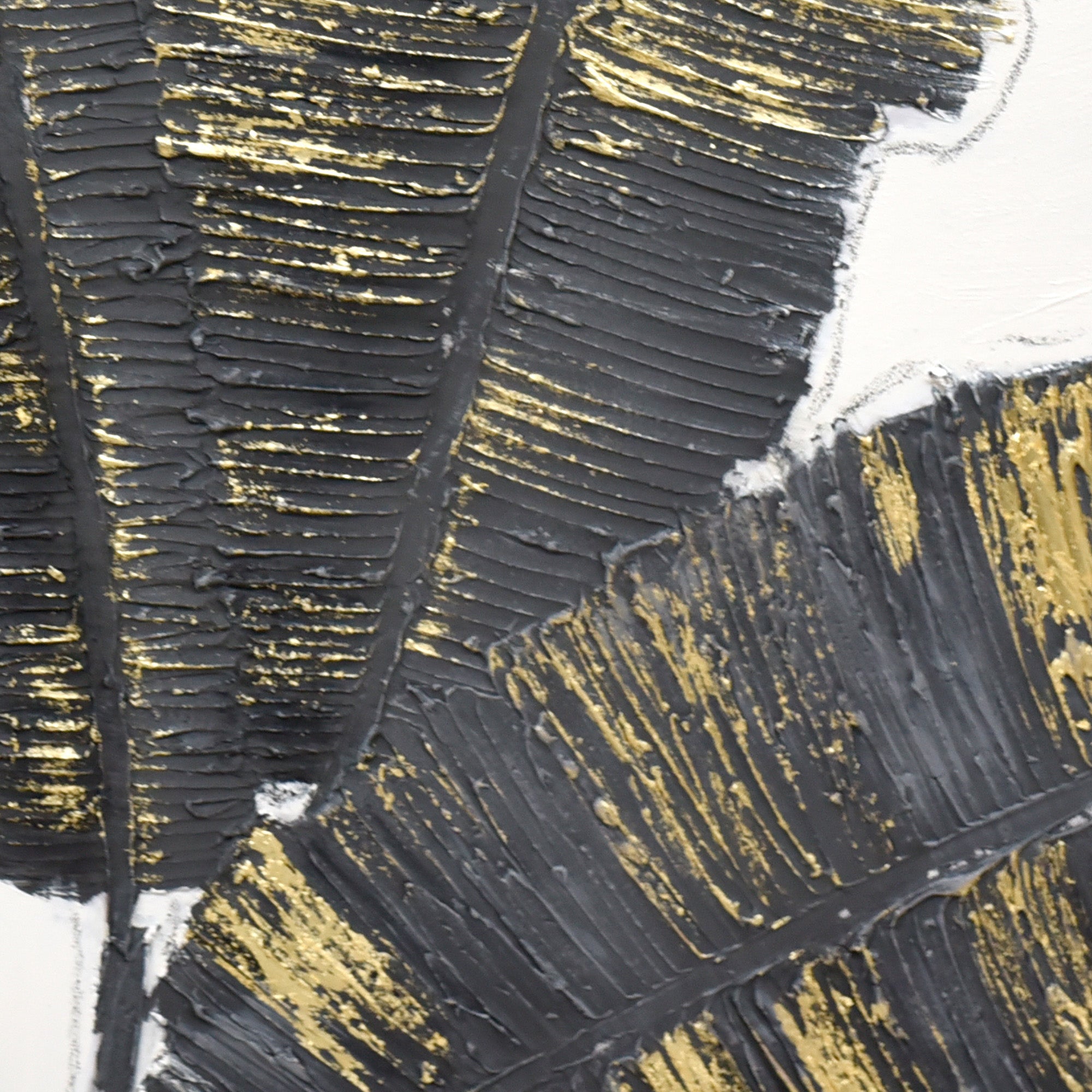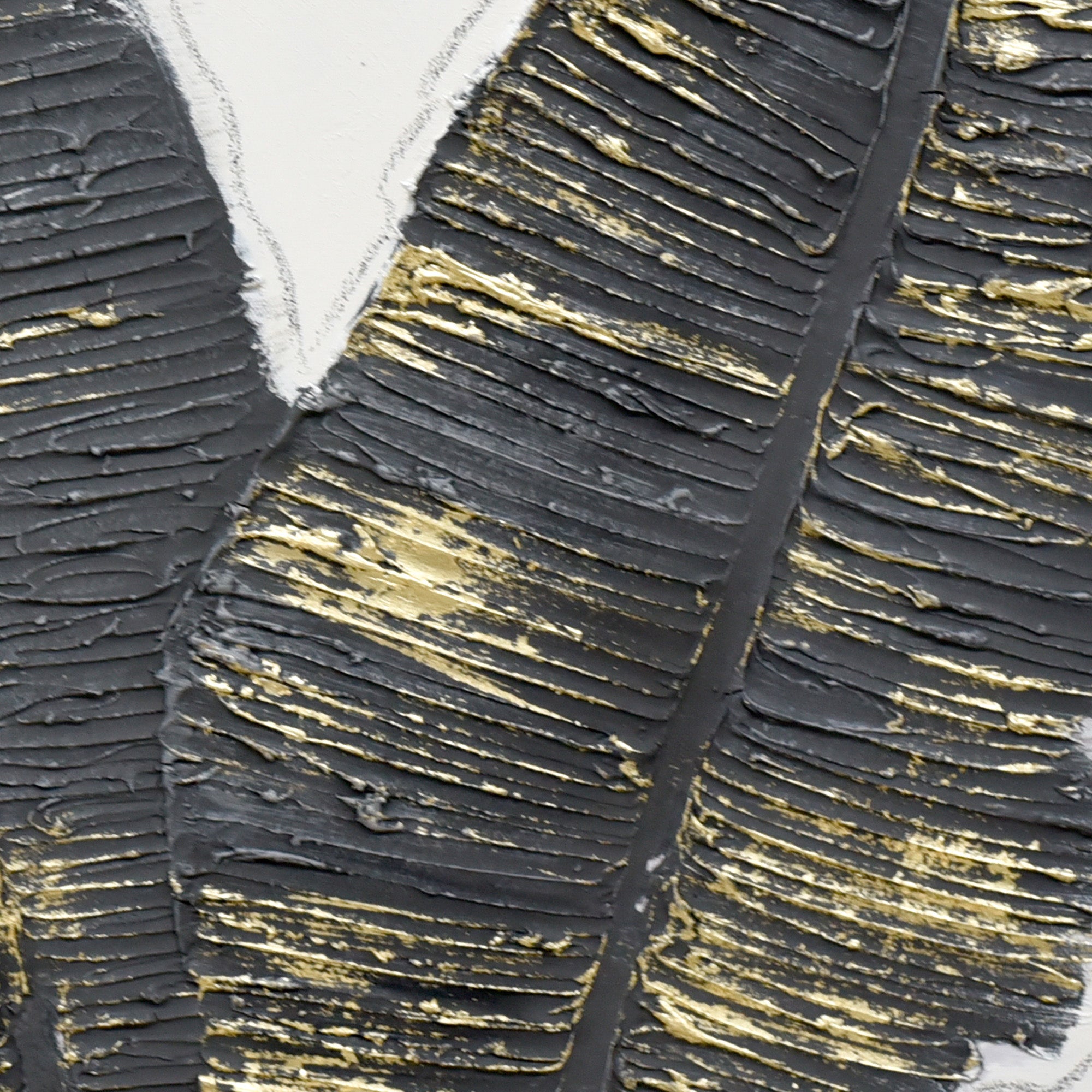 Drenched in the mystique of black and charcoal, “Noir Luminescence” is a testament to the harmonious interplay between light and shadow. This artwork showcases five large banana plant leaves, each meticulously hand-painted with a heavy texture, evoking a tactile allure. The deep, dark hues of the leaves are contrasted beautifully by the gold highlights, creating a visual rhythm that dances across the canvas. Set against a pristine white background, the leaves seem to emerge from the canvas, their gold accents shimmering like stars in the night sky. The light wood frame complements the composition, adding warmth to the contrasting shades. Crafted with passion and precision, “Noir Luminescence” is more than just a visual treat; it’s an exploration of nature’s beauty through the lens of abstraction.