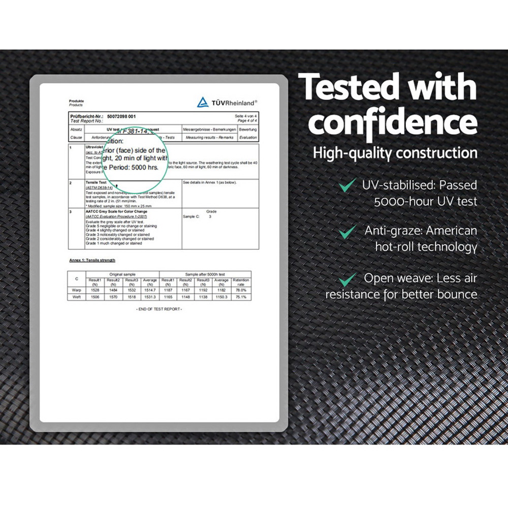 Bounce to your heart’s content with our Trampoline. With its superior bounce characteristics featuring 64-piece triple rate springs, the 10-foot trampoline enables safe and durable bouncing with no worries. The heavy-gauge steel framework is designed to handle all robust play and is UV-tested for quality and reliability. Other great features include 8 posts for strong support, 20mm thick padding, anti-graze mat, safety netting and a double-lock zip-and-clip entry. So jump to it and order our trampoline today.