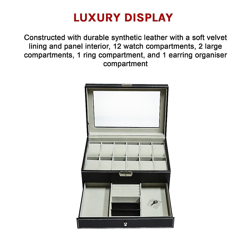 12 Grids Watch Display Case Leather jewellery Storage Box Organiser Lock Key