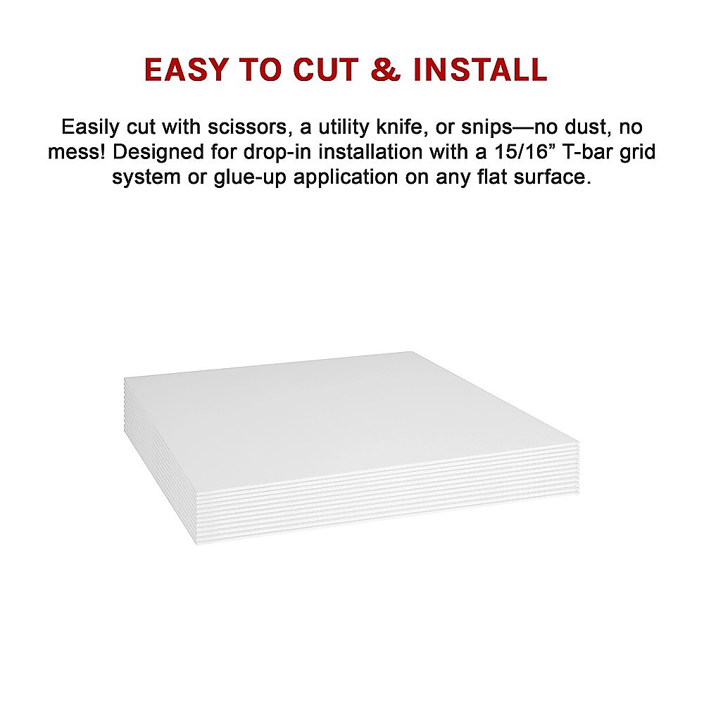 ✅ Easy to Cut Install Easily cut with scissors, a utility knife, or snipsno dust, no mess! Designed for drop-in installation with a 15/16 T-bar grid system or glue-up application on any flat surface.