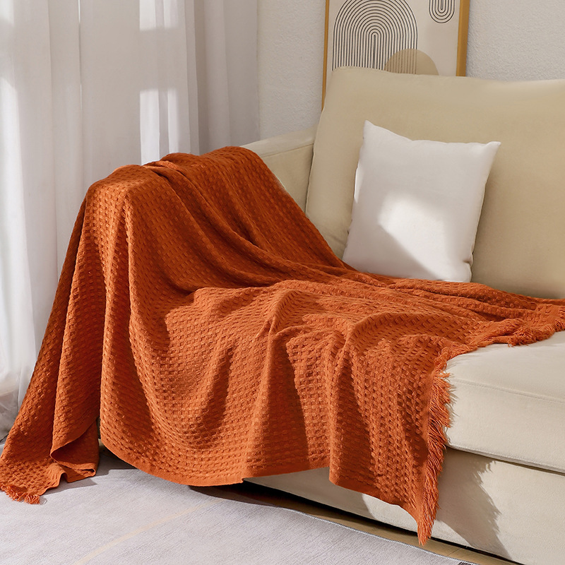 130*230CM Caramel Nordic Solid Color Knitted Sofa Throw Blanket with Tassels – Waffle Weave Polyester Decorative Blanket