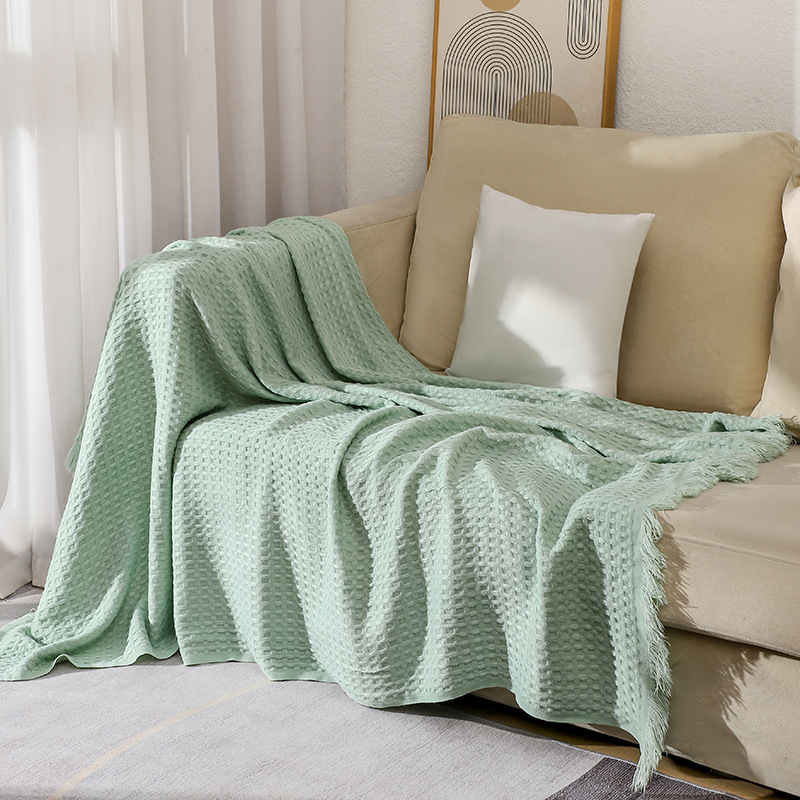 130*230CM Cyan Nordic Solid Color Knitted Sofa Throw Blanket with Tassels – Waffle Weave Polyester Decorative Blanket