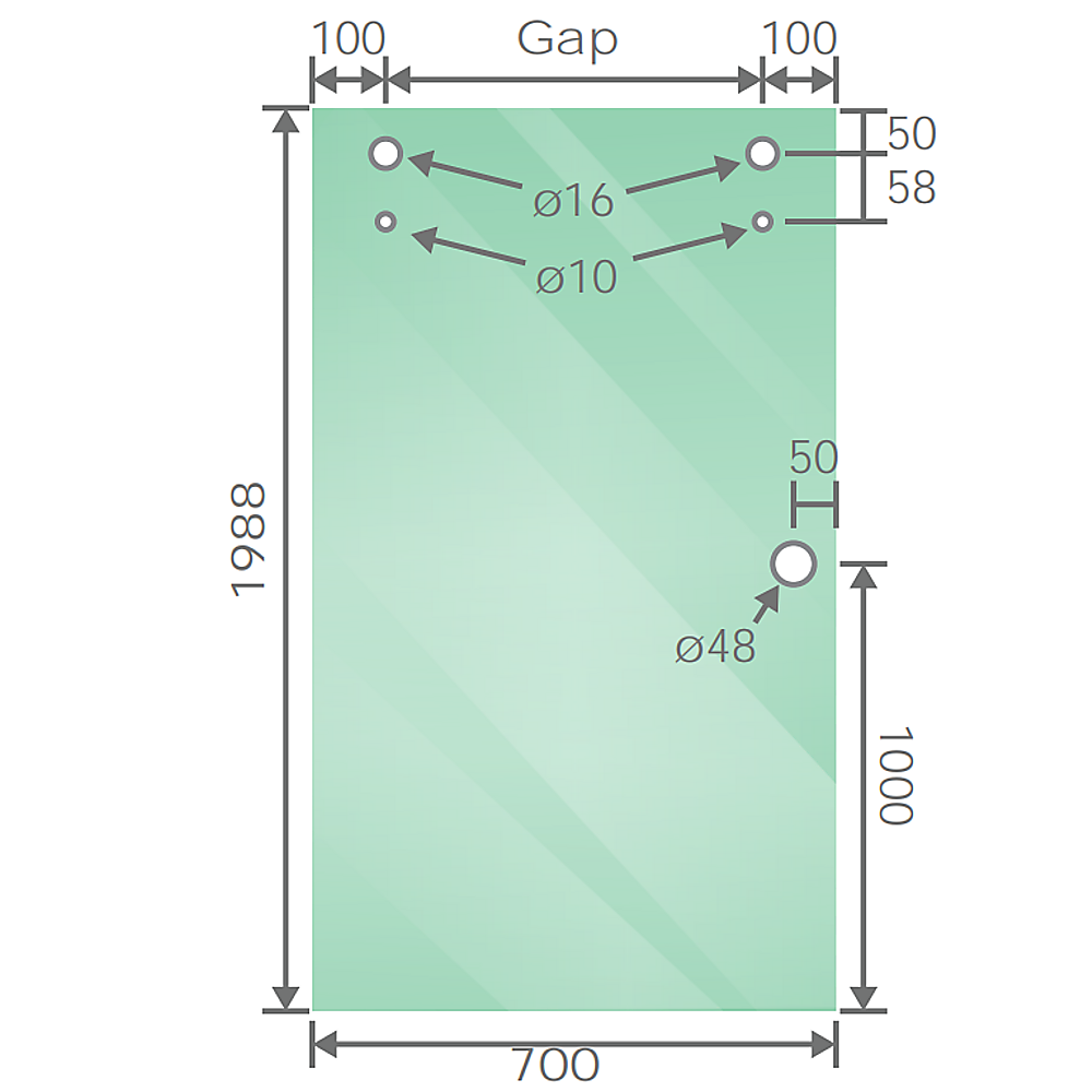 Tailored for a frameless shower screen featuring a sliding door, glass screen for the side panel showcases 10mm clear toughened glass with 2mm radius corners and polished edges. All measurements are in millimeters, and the panels come pre-drilled to seamlessly fit various styles of shower hardware.