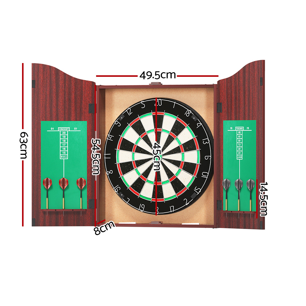 Get competitive at your next party or function with a classic Dartboard Cabinet. The dartboard is made from premium quality sisal fiber panels with a sturdy rotating score ring and features six heavy-duty darts for classic play, all stored in a practical and sophisticated dartboard cabinet. The board has unique features such as a staple-free divider to prevent bounce-out, an extended dart catchment area and protective rubber feet. The sisal fiber panels are self-healing and the scoring ring rotates to extend the life of your dartboard. The darts are made from stainless steel and feature a skid-resistant grain and flexible top, giving you more control over the flight path. The cabinet features a handy scoreboard, integrated dart storage, and a delightfully smooth exterior. The board is not only a fun game but its elegant design will suit any home or business. Easy to assemble with the included wall mount bracket and fixings, youll have plenty of fun with our sporty premium Dartboard.