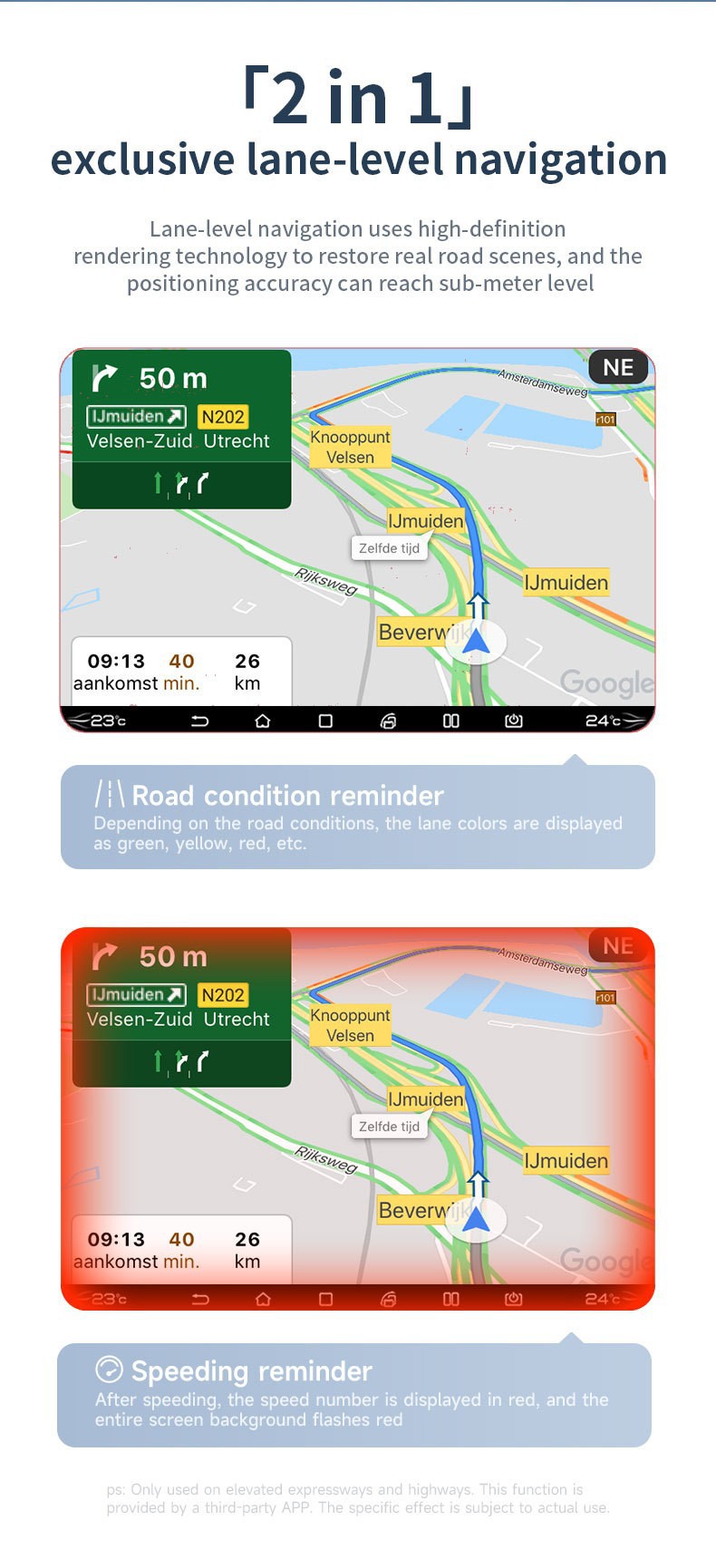 - Advanced Navigation Features (App Dependant): Includes lane-level navigation, road condition reminders (visualized by lane coloring), and speeding reminders.