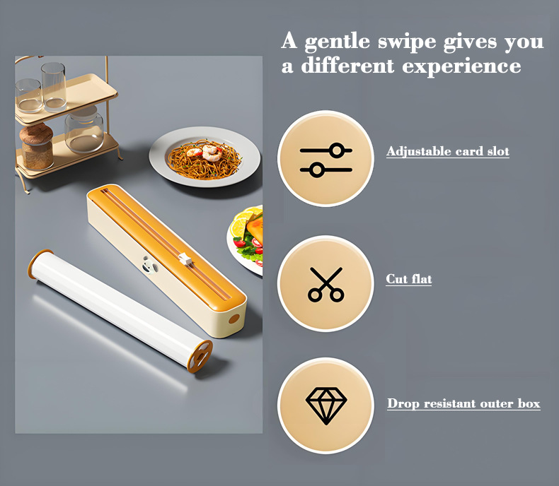 Simplify your kitchen prep with our Bidirectional Cling Film Cutter. This versatile wrap dispenser is designed for smooth and precise cutting of cling film, aluminum foil, parchment paper, and wax paper. Featuring a bidirectional sliding knife, it ensures neat cuts every time, making food storage and preparation more efficient. Made from durable ABS material, this reusable cutter is a must-have tool for any kitchen, offering both functionality and a sleek, modern design. (Cling film not included.)
