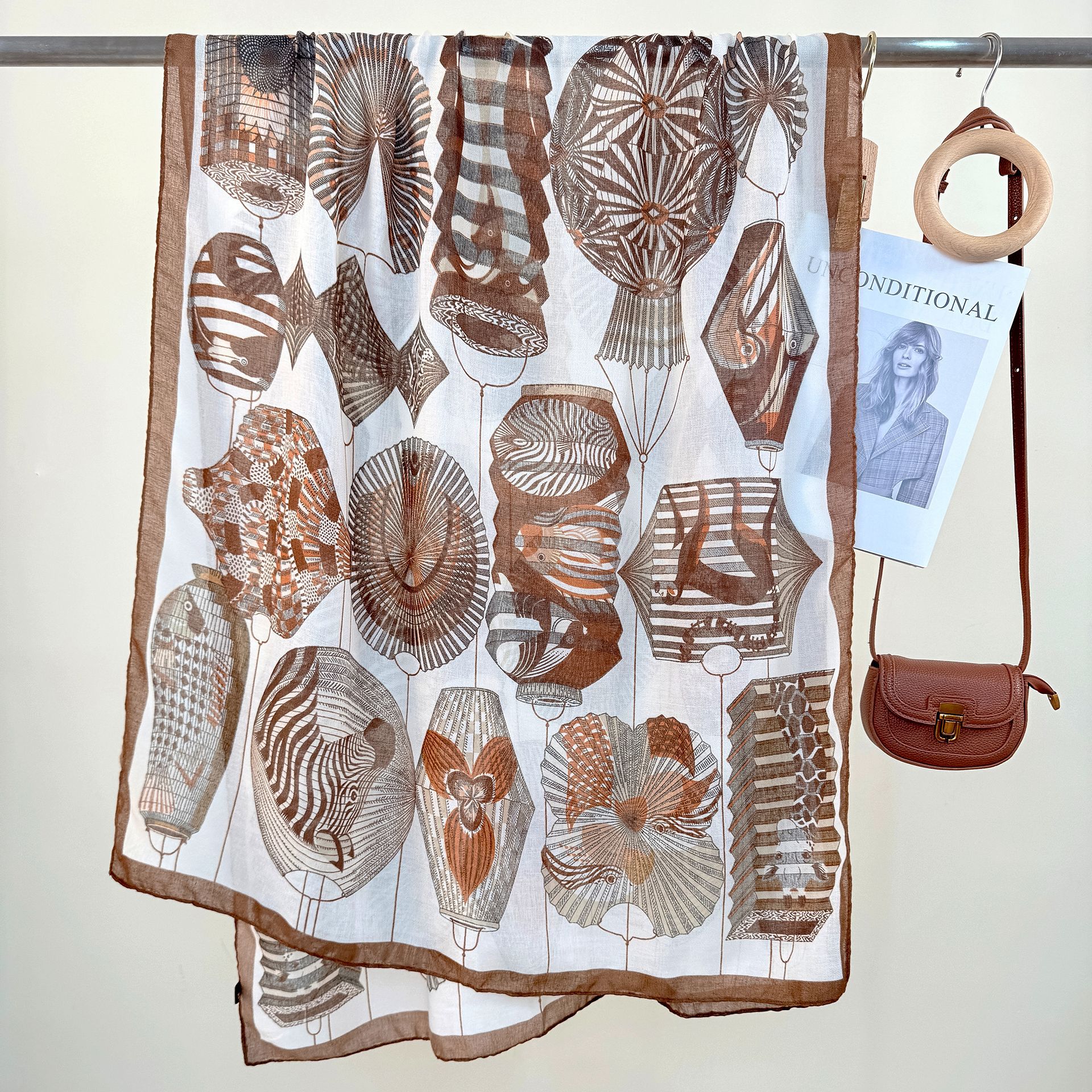 2-Piece Brown Border Retro Lantern Print Scarf – Fashionable Niche Design for Women