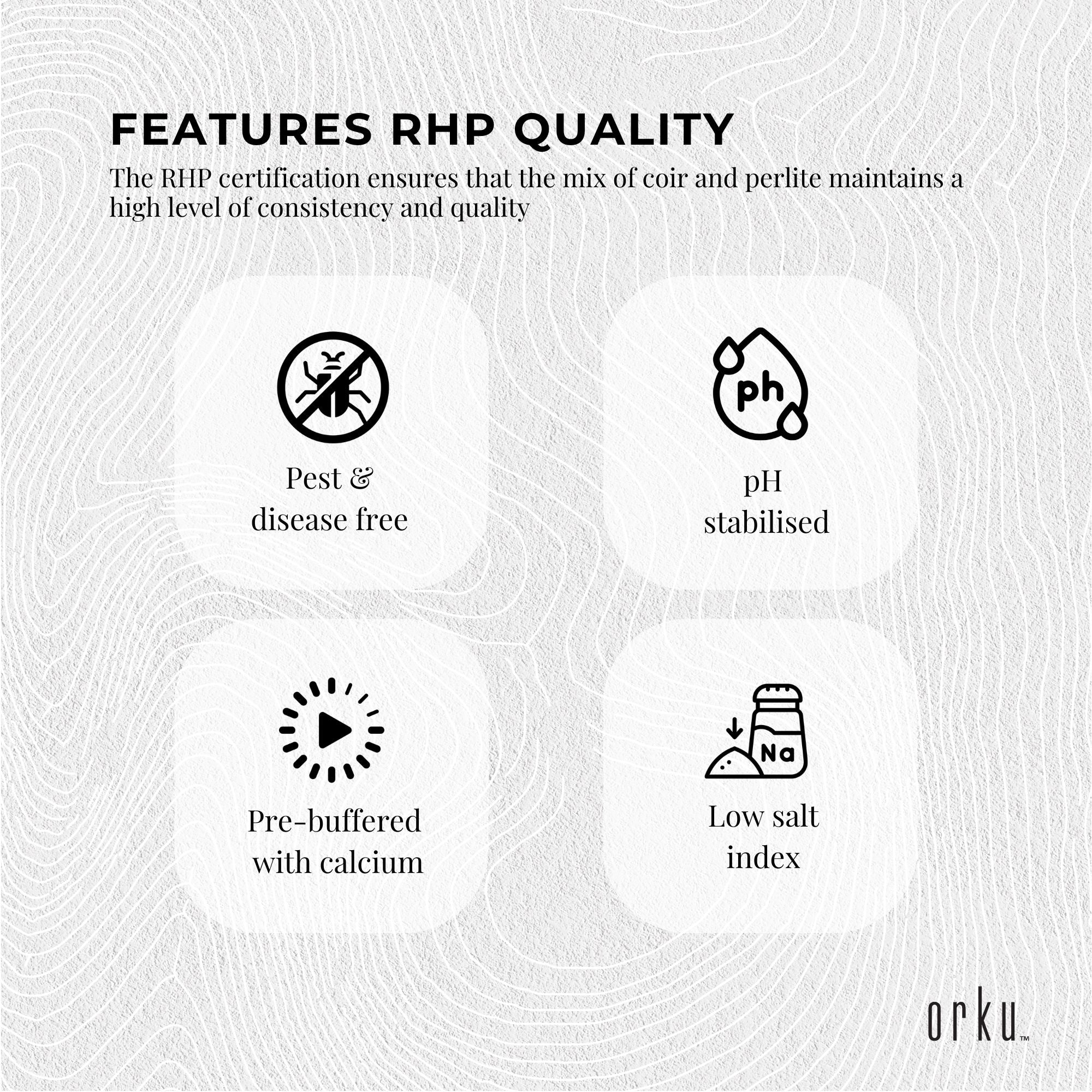 Coco Perlite consists of a blend of 70% high-quality desiccated coconut husk (coir) and 30% perlite, making it a reliable and easy to use substrate for hydroponic systems. The RHP certification ensures that the mix of coir and perlite maintains a high level of consistency and quality, is pest and disease free, thoroughly rinsed, pH stabilised, pre-buffered with calcium, and has a very low salt index.