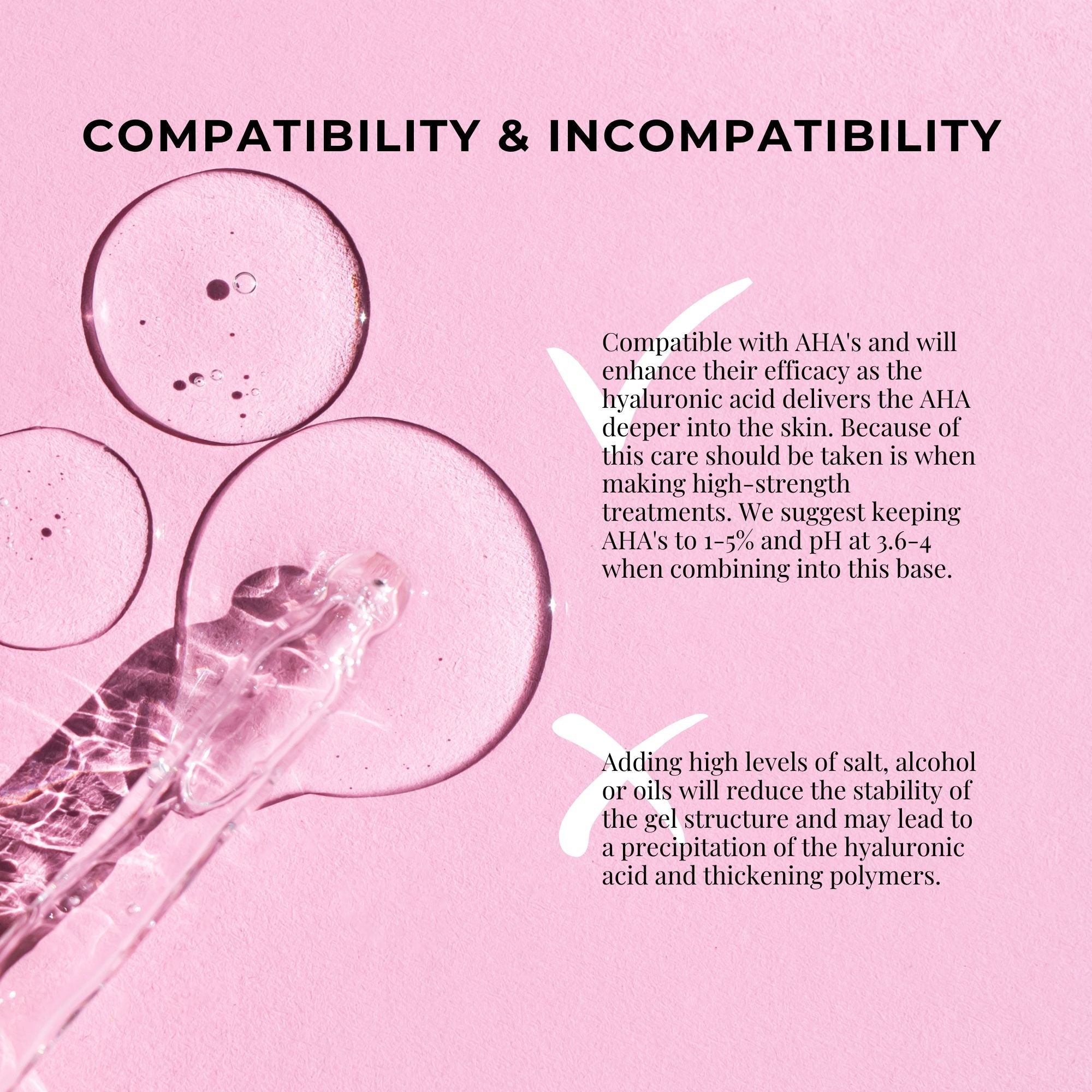 • Compatible with AHA’s and will enhance their efficacy as the hyaluronic acid delivers the AHA deeper into the skin. Because of this care should be taken is when making high-strength treatments. We suggest keeping AHA’s to 1-5% and pH at 3.6-4 when combining into this base.