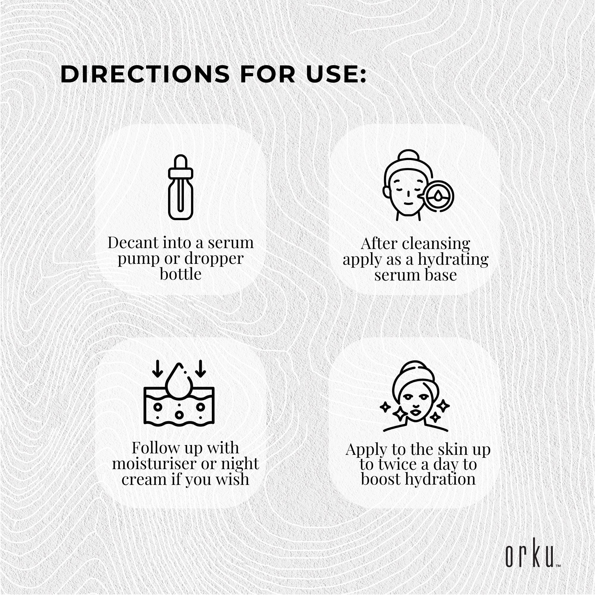 Directions For Use: Decant into a serum pump or dropper bottle and use after cleansing as a hydrating serum base. You can then follow up with moisturiser or night cream if you wish.