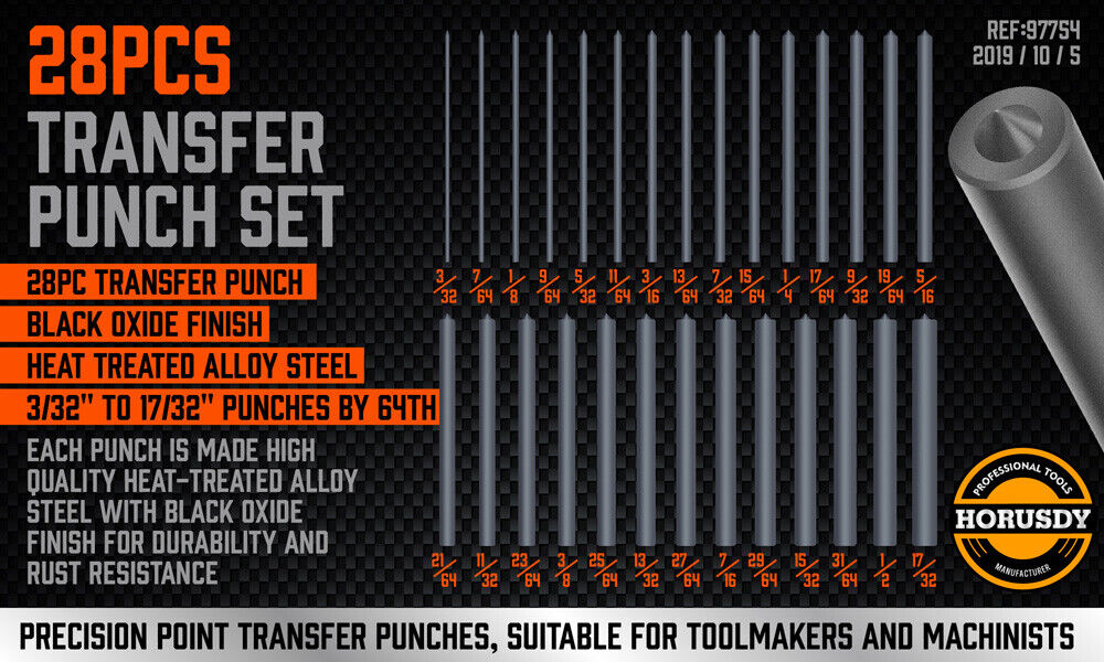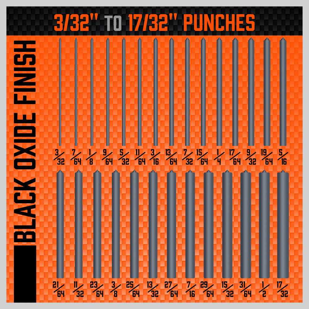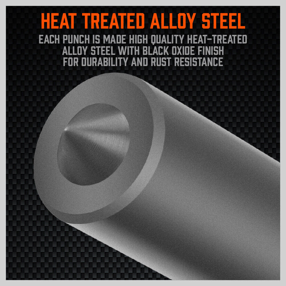 - Each punch is made high quality heat-treated alloy steel with black oxide finish for durability and rust resistance