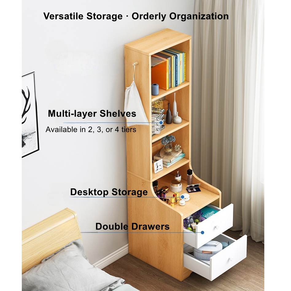 This modern minimalist bookcase bedside table features a pure warm white design, combining storage, display, and decorative functions. The upper section has four open storage shelves for placing books, decorative items, photo frames, and other objects, showcasing personal taste and style. The bottom section features two spacious drawers with matching round knobs, providing ample private storage space. The elegant curved side design adds a soft touch, and the top includes a hook for hanging bags, tapestries, or other items. This slim tall cabinet design doesn’t take up much space, making it especially suitable for small bedrooms, serving as the perfect combination of bookshelf, display cabinet, and bedside table, both practical and decorative.