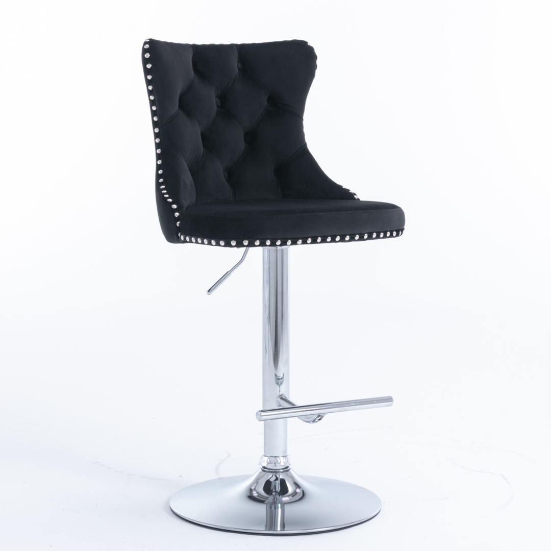 2x Height Adjustable Swivel Bar Stool Velvet Studs Barstool with Footrest and Chromed Base- Black