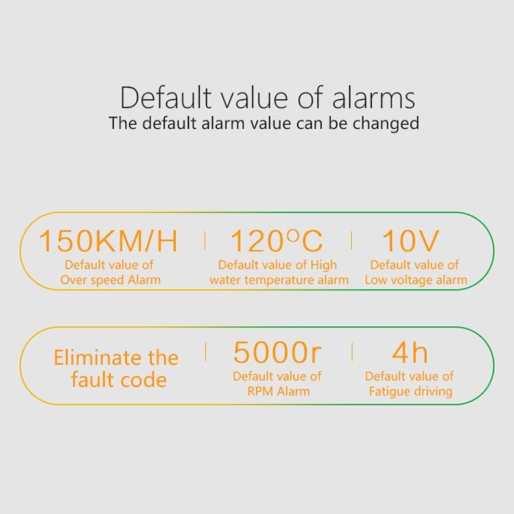 • Displays speed, RPM, water temperature, voltage, instantaneous fuel consumption, average fuel consumption, driving distance, shift reminders, fatigue driving reminders, low voltage alarm, high water temperature alarm, over speed alarm, and engine failure alarm
