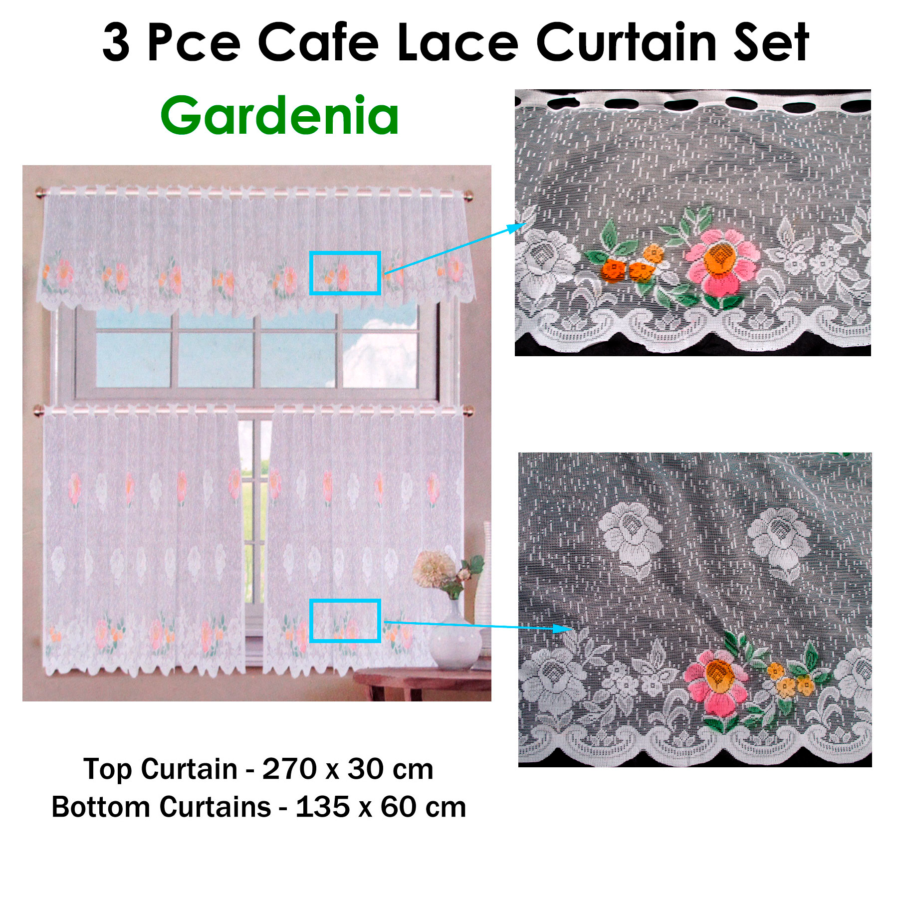 3 Pce Cafe Gardenia Lace Curtain Set
