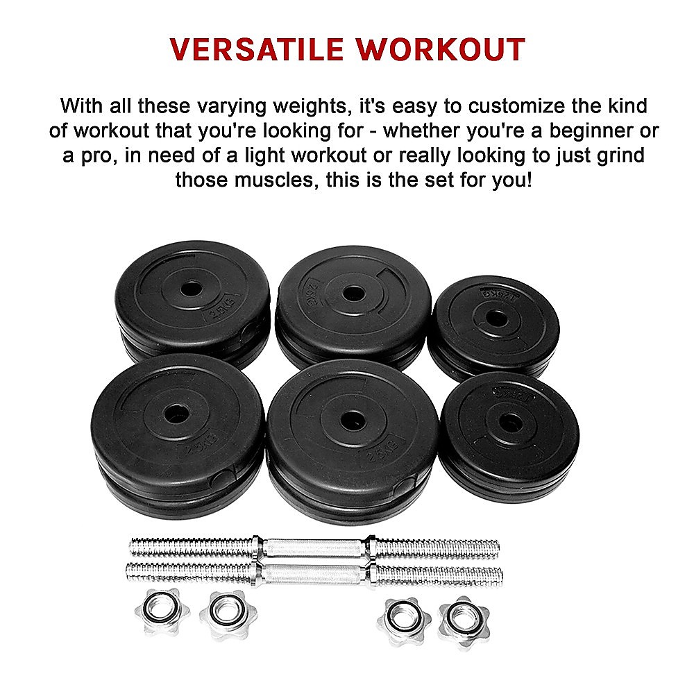 The set comes with twelve plastic-coated cement plates in small increments, so you can increase your load gradually as you build your strength. Star-shaped nuts made from high-quality steel keep the weights in place for easy lifting.