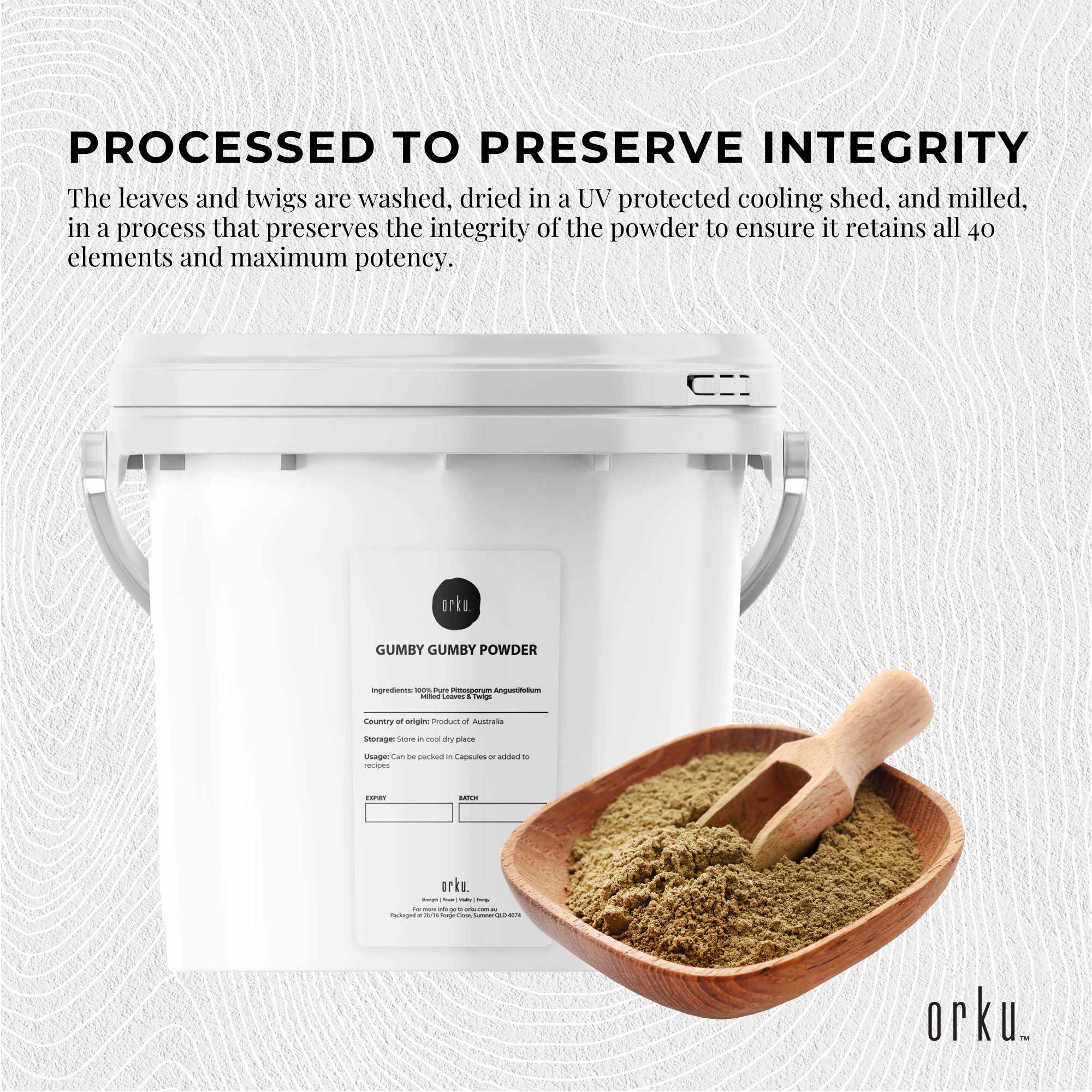The leaves and twigs are washed, dried in a UV protected cooling shed, and milled, in a process that preserves the integrity of the powder to ensure it retains all 40 elements and maximum potency.
