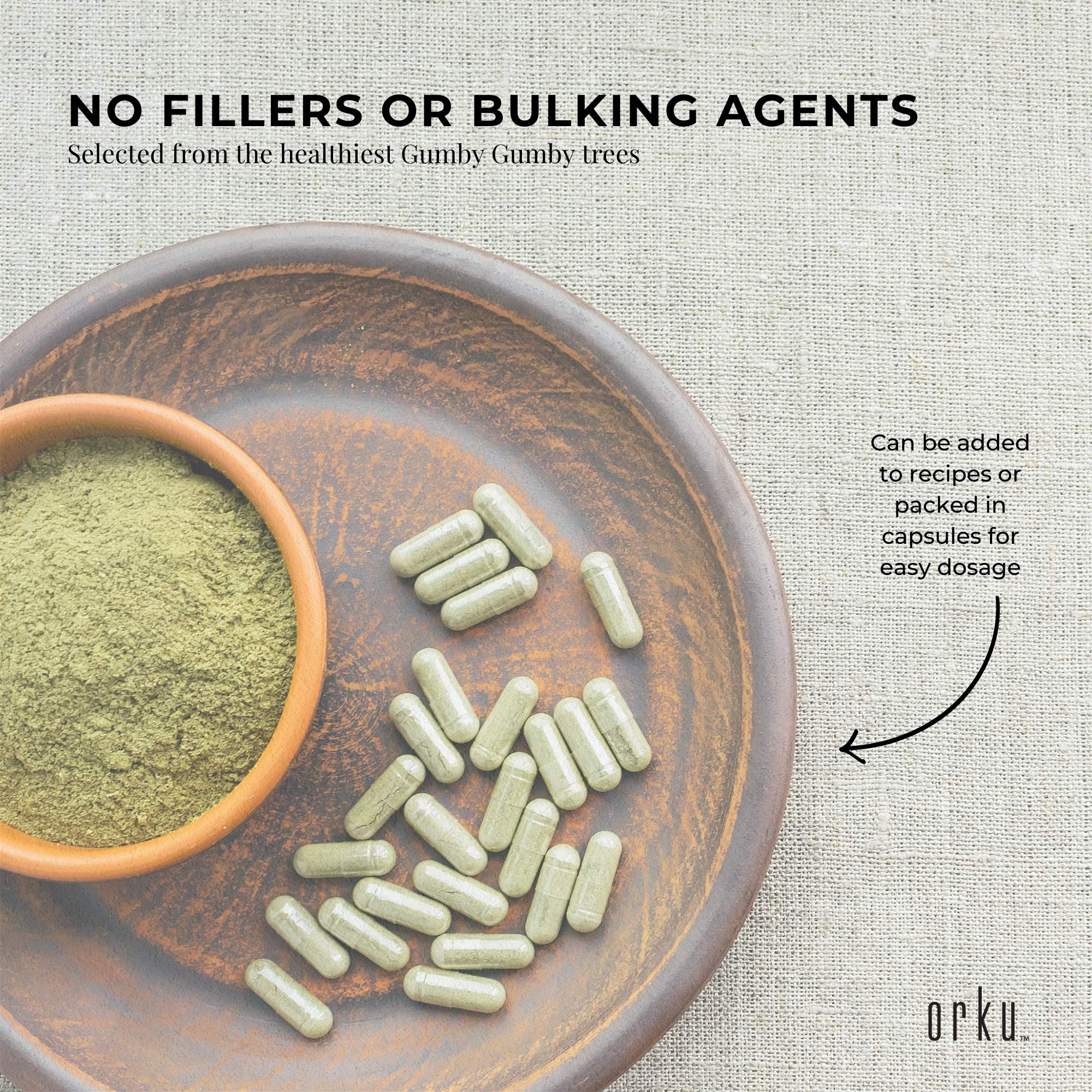 Orku Gumby Gumby (aka GumbyGumby) powder is made from hand selected leaves and green twigs of only the youngest shoots of healthy Gumby Gumby trees.