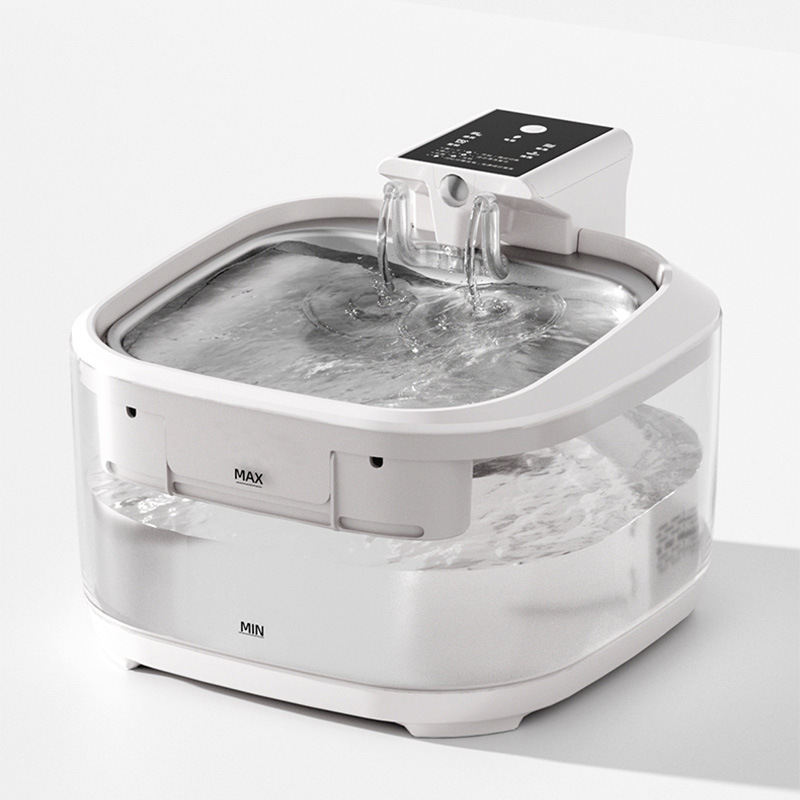 Dual-Flow Smart Pet Water Fountain featuring an intelligent digital display and a choice of dual water flow with an included faucet attachment. This sleek white water dispenser includes a stainless steel plate for better water quality, a charging cable, and a filter to ensure fresh water for your pet. The dual-flow design allows you to switch between regular flow and faucet-style flow for pets who prefer a more dynamic drinking experience.