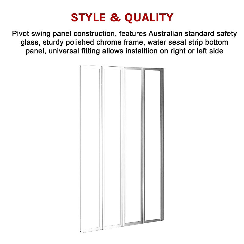 Our four-fold chrome bath shower door panel will brighten your existing bathroom or be a welcome improvement as a part of your bathroom renovation. This folding shower screen is a plus for both the homeowner and the home developer. The panel's frame is constructed of the highest quality polished chrome and the AS/NZS 2208 approved glass ensures safety and reliability.