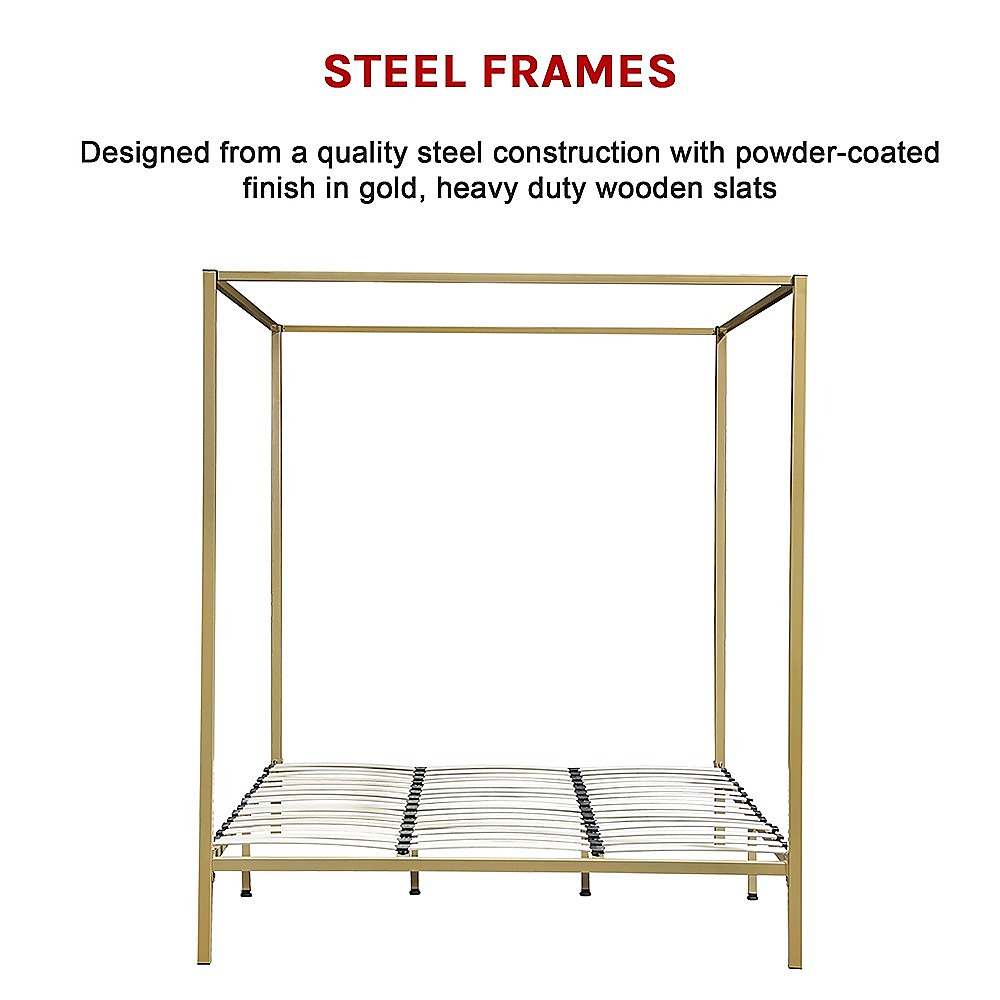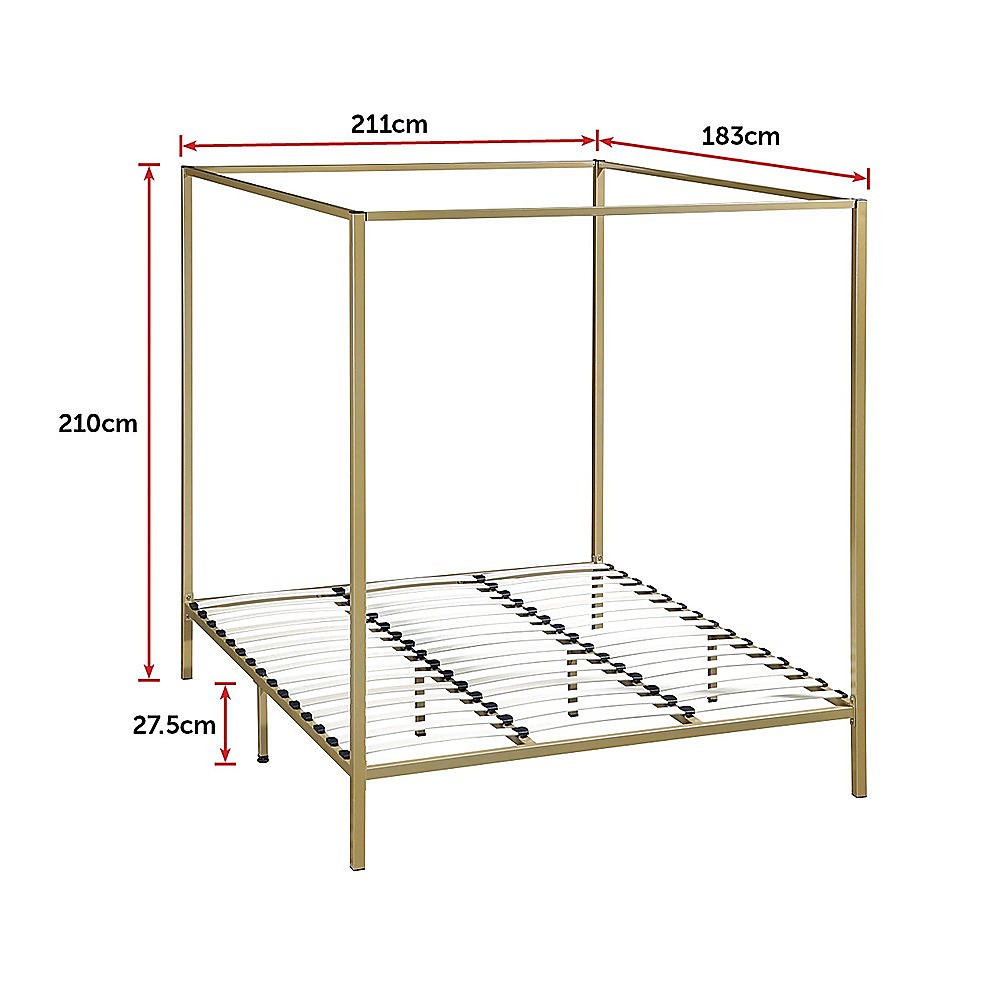 The bed's sleek gold frame is trendy and modern, making it a perfect choice for the 21st Century home. But if you prefer a more old-style', romantic look, its modest design means that it is easily dressed with drapes in order to achieve the style you want. What's more, the frame's neutral gold allows it to fit in with any colour scheme – Versatility at its best.