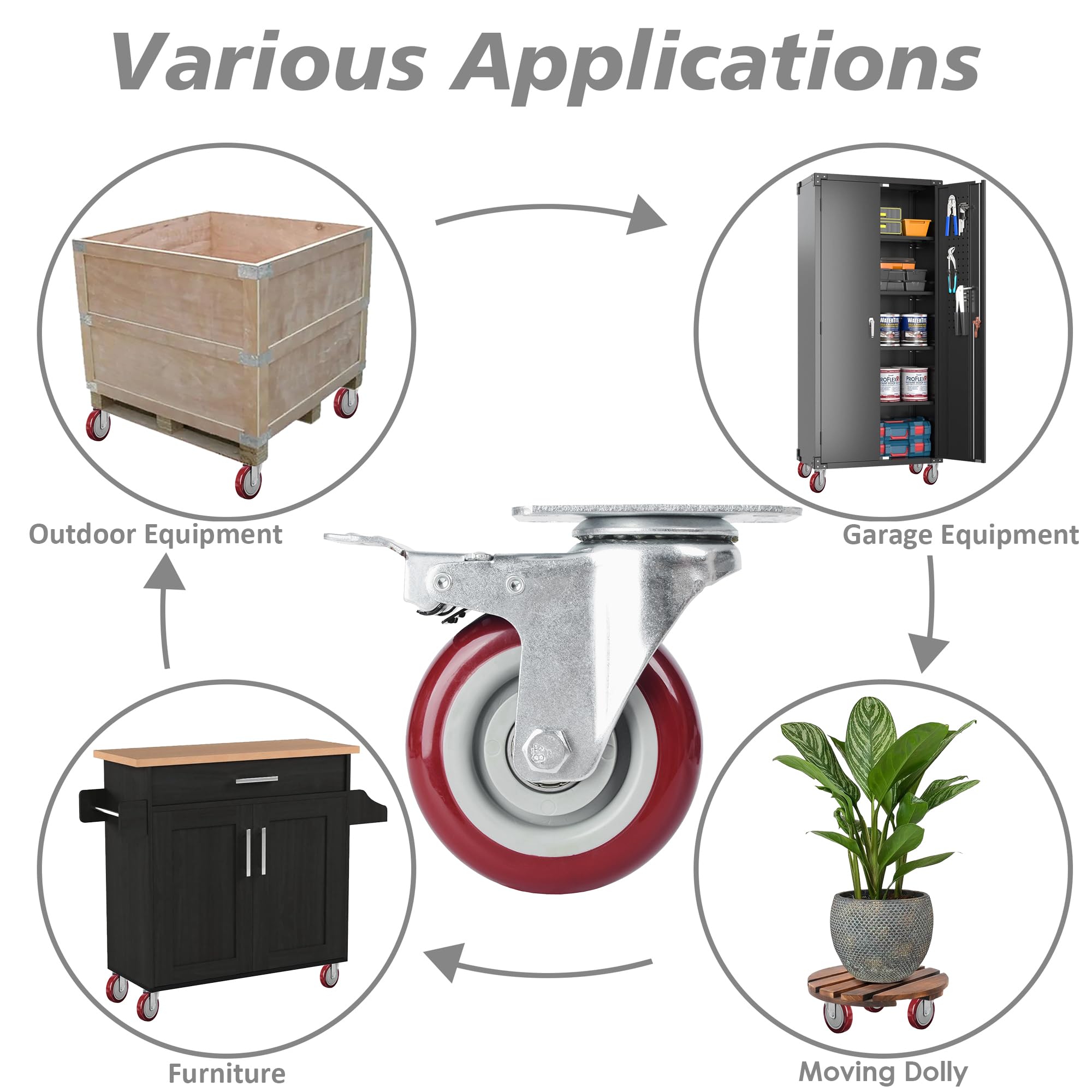 The 4″ casters feature a polyurethane protective wheels, integrated steel sleeve bearings, and a sleek modern industrial design ideal for work or exterior design elements