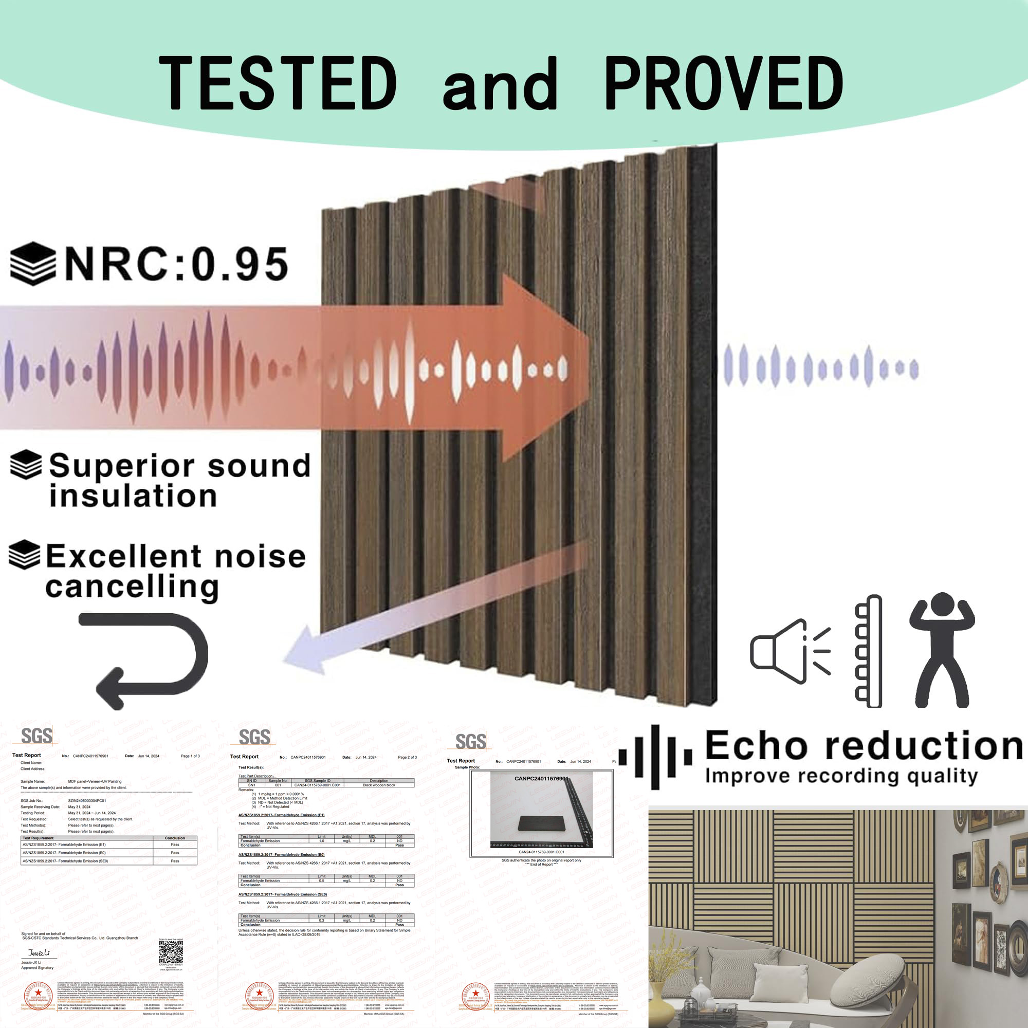 - Material: Made of wood-textured laminate, eco-friendly MDF, and high-density acoustical polyester fiber, ensuring durability and excellent sound absorption.
