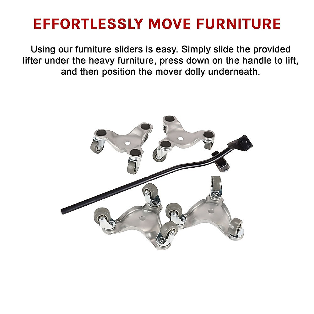 Using our furniture sliders is easy. Simply slide the provided lifter under the heavy furniture, press down on the handle to lift, and then position the mover dolly underneath. Repeat this process for all corners until securely installed. Once in place, smoothly push the furniture to its new location with minimal effort.