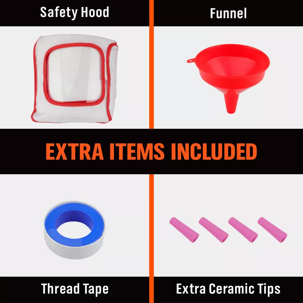 Featuring an easy-to-use media delivery gun with a spring-loaded auto-closing nozzle, and four ceramic nozzles. The portable blaster removes paint, rust, and corrosion easily. The long 2.5 metre hose reaches into tight spaces, while safety features like a feeding valve, non-slip handles, and fixed feet ensure peace of mind during operation. The kit includes a safety mask, thread tape, and funnel, making it a “ready to blast” solution.