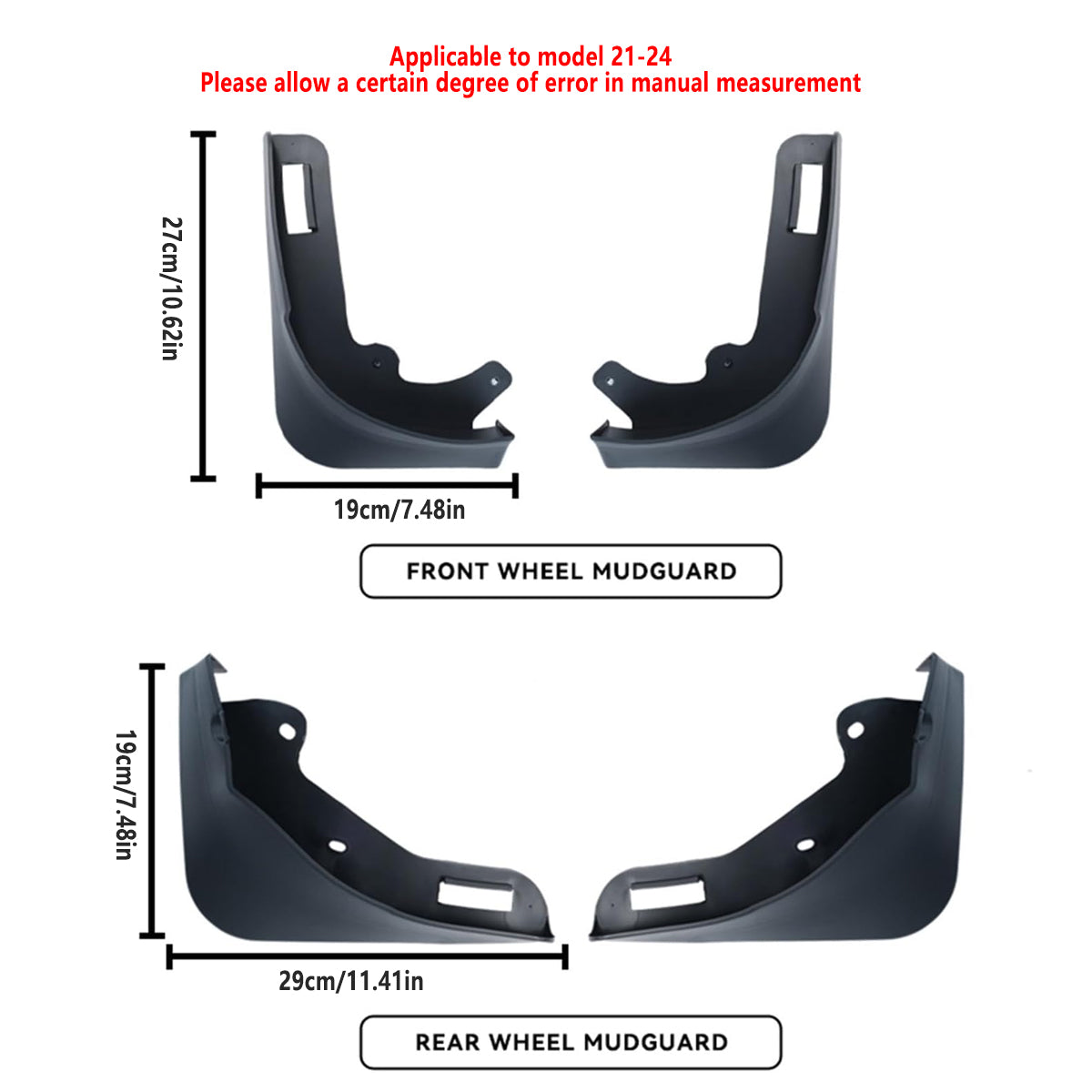 Protect your vehicle from road spray and debris with this 4-piece set of soft rubber fender guards. Designed for easy installation without drilling, these guards provide front and rear wheel coverage while maintaining a clean appearance. Their flexible construction ensures durability and a snug fit, helping reduce splash damage and preserve bodywork across seasons.