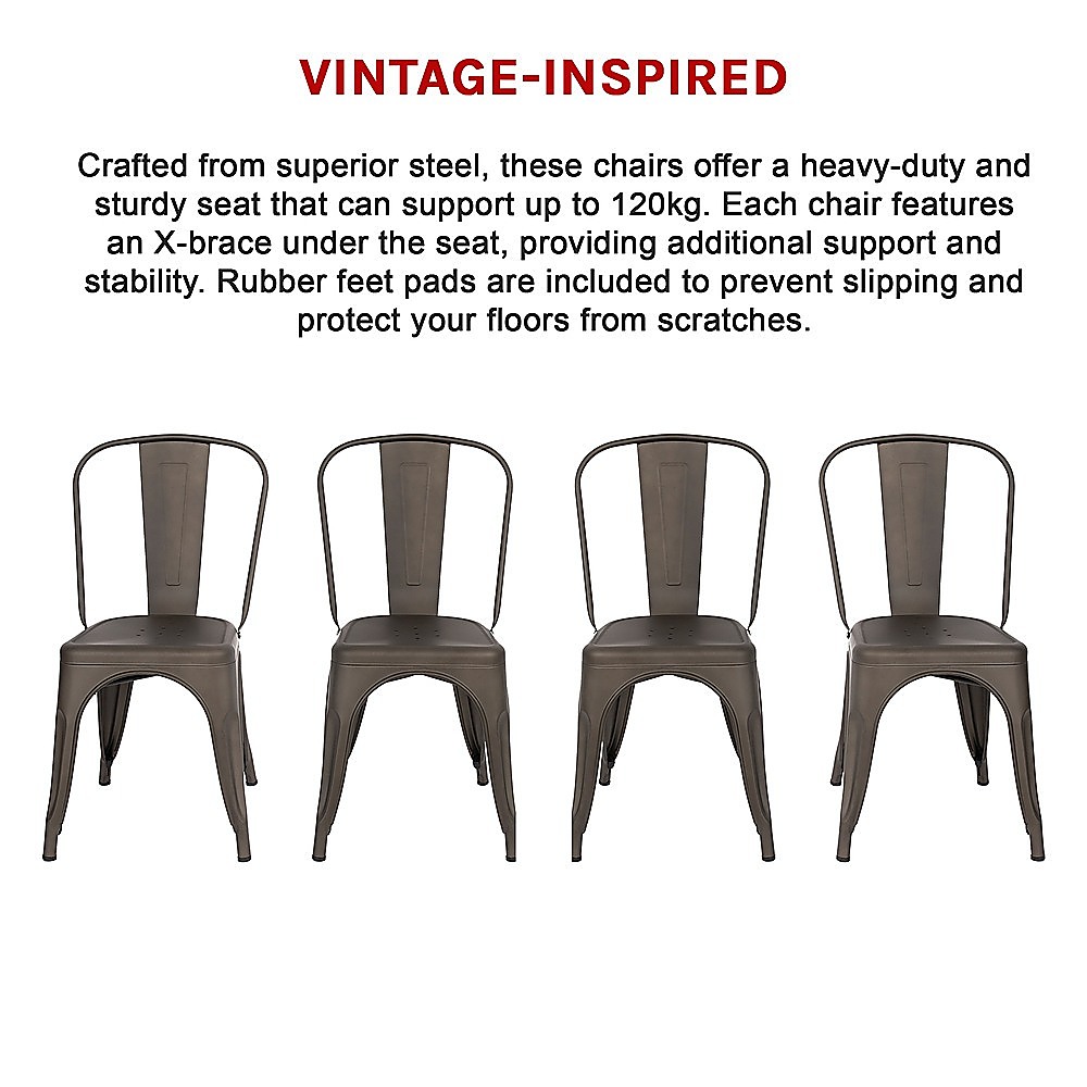 Crafted from superior steel, these chairs offer a heavy-duty and sturdy seat that can support up to 120kg. Each chair features an X-brace under the seat, providing additional support and stability. Rubber feet pads are included to prevent slipping and protect your floors from scratches.