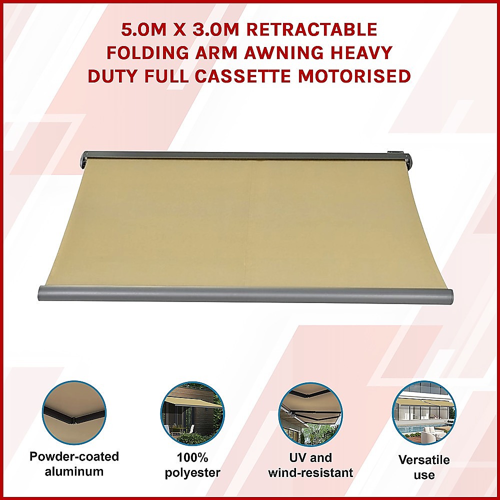 5.0m x 3.0m Retractable Folding Arm Awning Heavy Duty Full Cassette Motorised