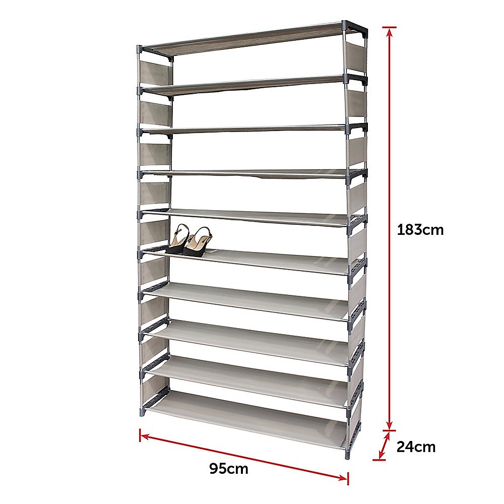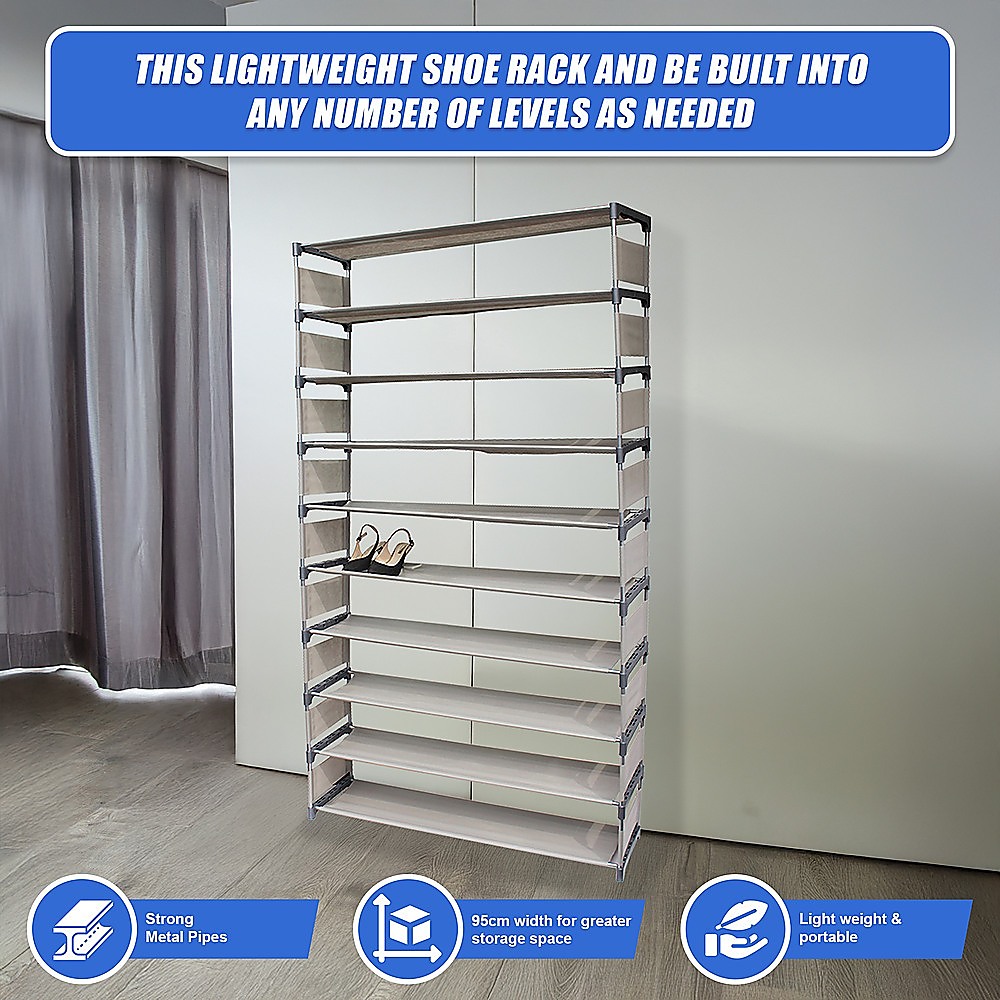 A perfect storage solution for the person who has too many shoes this 10 Tier Stackable Shoe Rack – 50 Pair! Unclutter your life and free up that wasted space into a neat tidy tower of shoes and be the envy of everyone! Picking out a shoe to fit your outfit is so much easier and convenient – with all your shoes conveniently located in one place, you'll never have to go looking for missing shoes ever again! Constructed of sturdy steel tubes and resin siding connectors, this lightweight shoe rack and be built into any number of levels as needed.