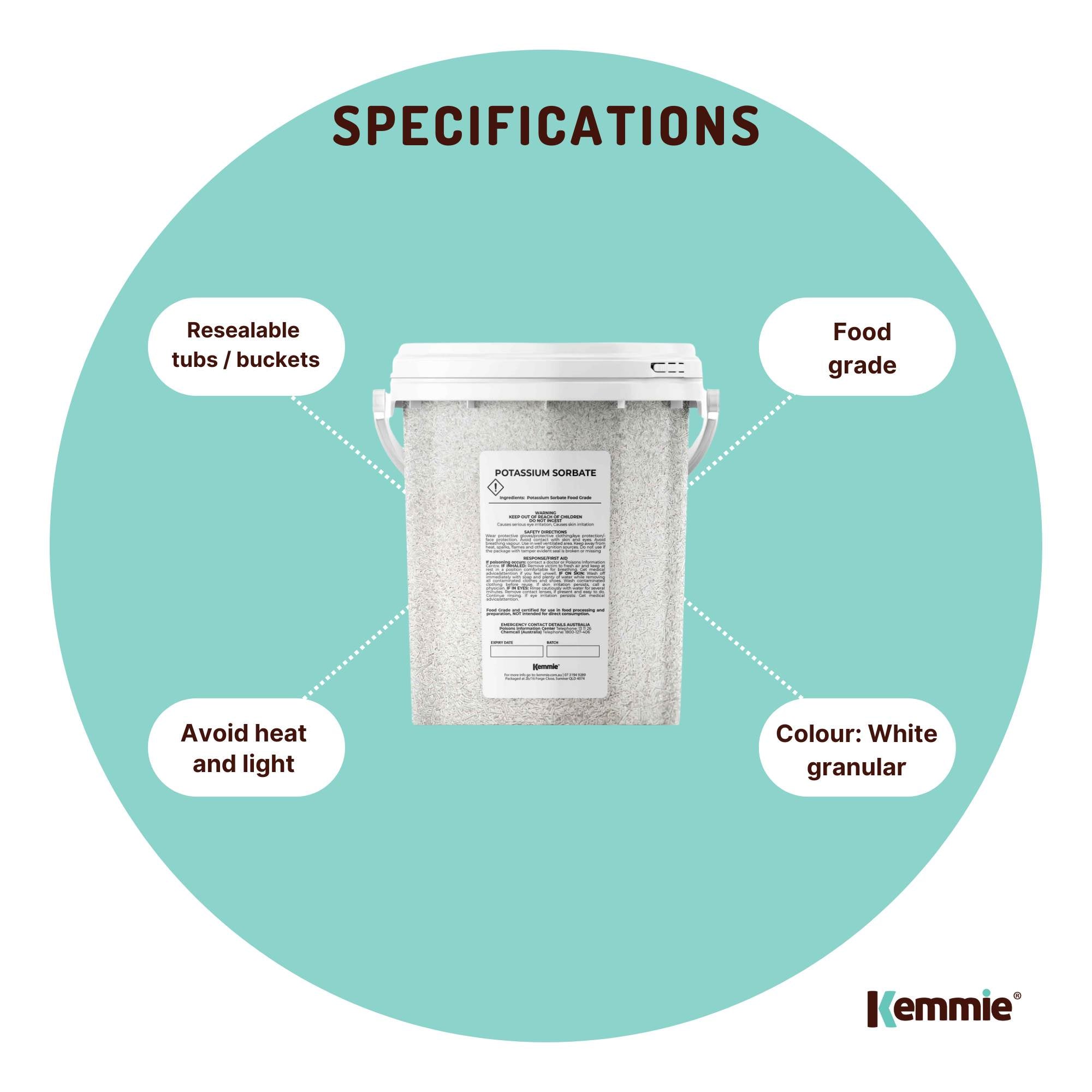 500g Potassium Sorbate Granules in resealable buckets.
