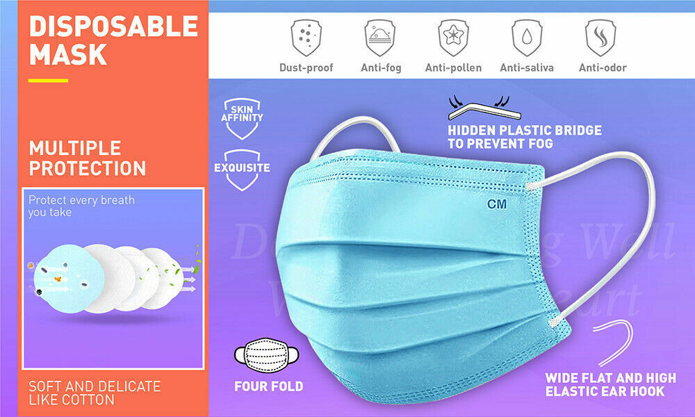 50Pc Face Masks General Daily Protection 3-Layer Anti Bacterial Filter Au Stock