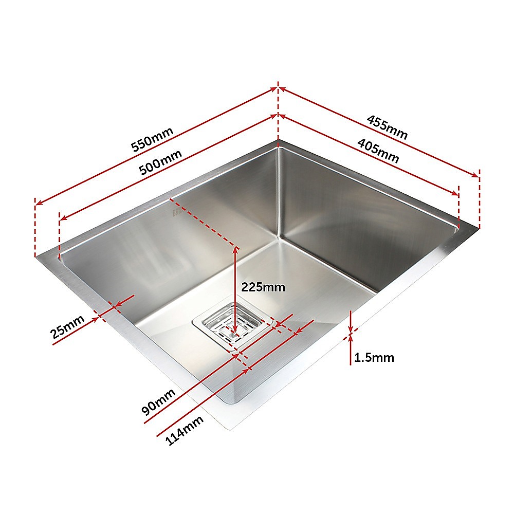 This single sink is made from 1.5mm-thick Type 304 stainless steel with a satin finish for a brilliant look that will last and last. It measures 550 x 455 x 255mm (L x W x D) with a 90mm drain opening. A Square Strainer waste is included. Installation is Undermount / Topmount-style.