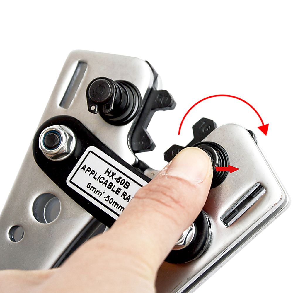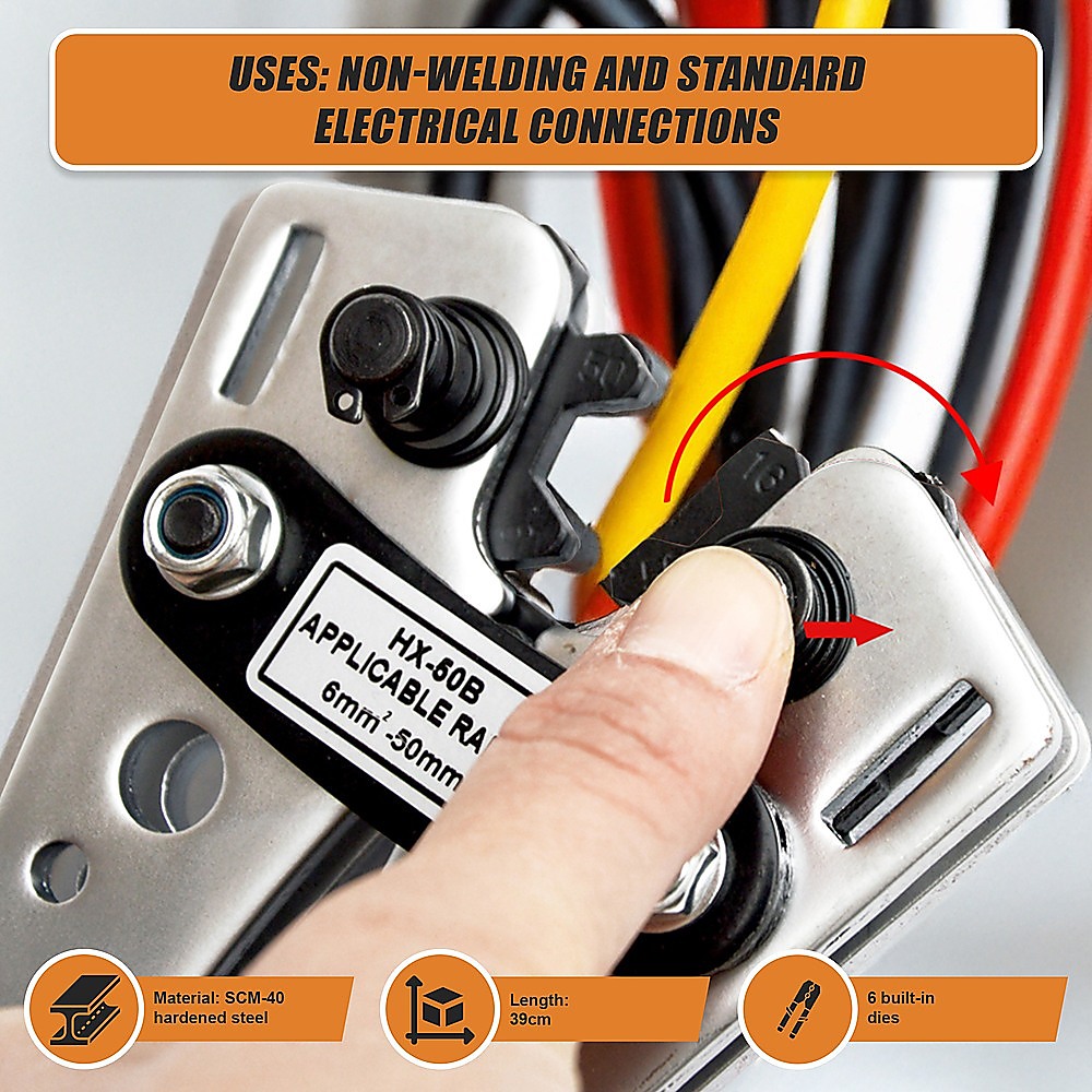 With six crimping sizes, you'll be able to work with wires of varying sizes, including 6 mm2 = 10 AWG, 10 mm2 = 8 AWG, 16 mm2 = 6 AWG, 25 mm2 = 4 AWG, 35 mm2 = 2 AWG, and 50 mm2 = 0 AWG.