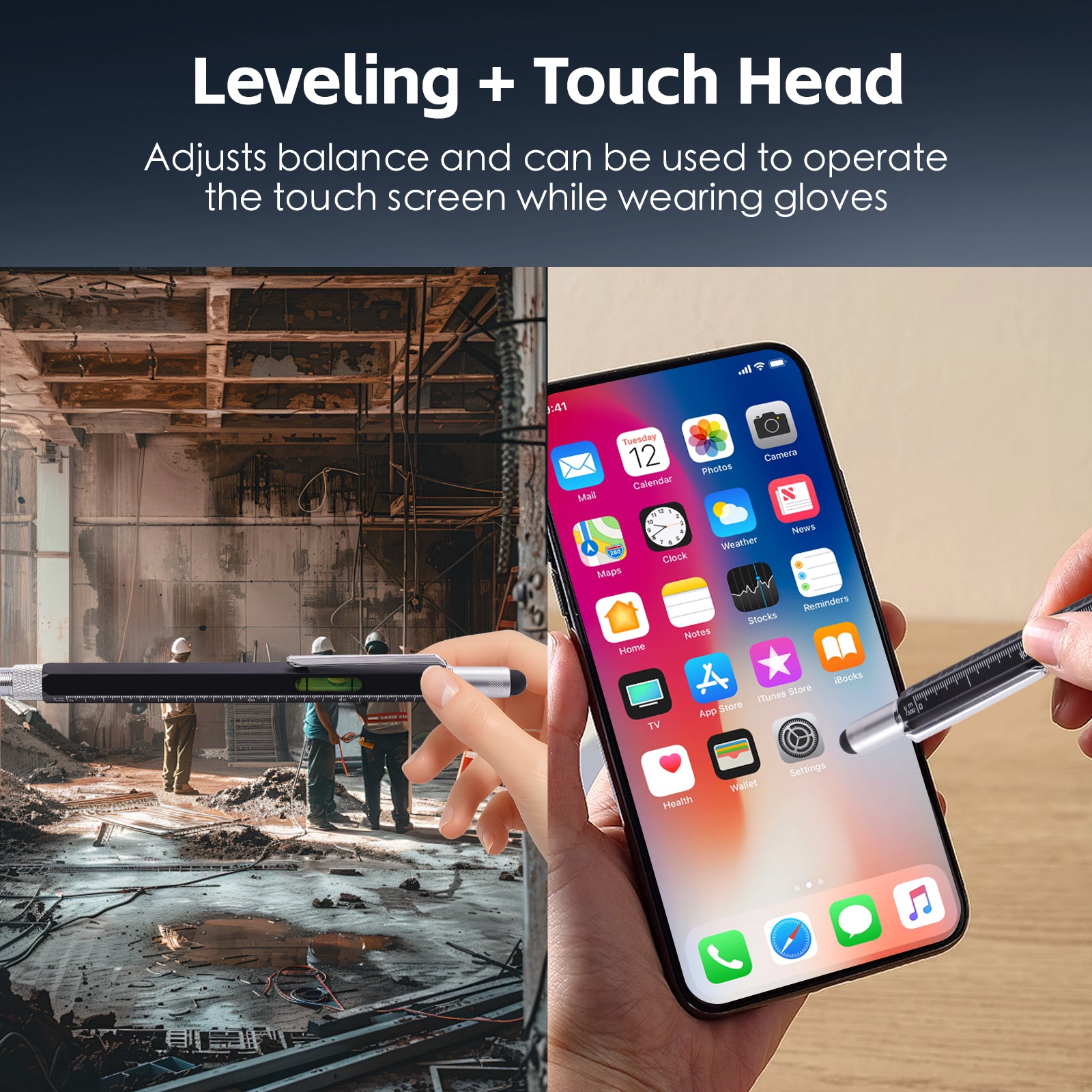 “All-in-One Versatility – This sleek pen combines six essential tools in one: a smooth ballpoint pen, a multi-scale ruler (4 measurements), a bubble level, a touchscreen stylus (glove-compatible), and dual screwdrivers (Phillips & flathead). Perfect for professionals and DIY enthusiasts alike!